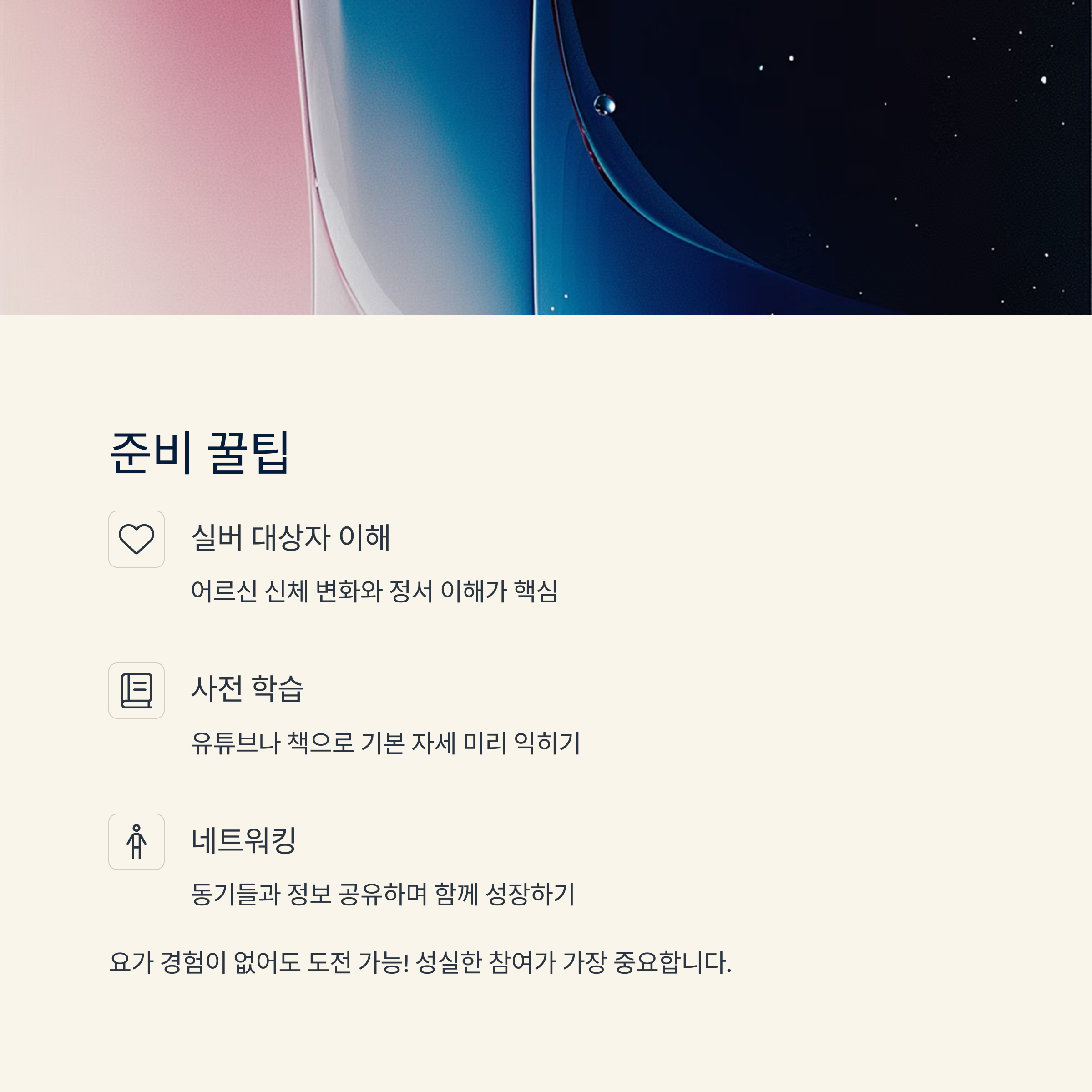 또한, 실버요가는 ‘정서적 교감’이 큰 부분을 차지해요. 수업 중에 어르신들과 눈을 맞추며 이야기하고 공감해주는 자세가 정말 중요하죠. 자격증 취득 전에 봉사활동이나 요양원 방문 경험이 있다면 큰 도움이 돼요.