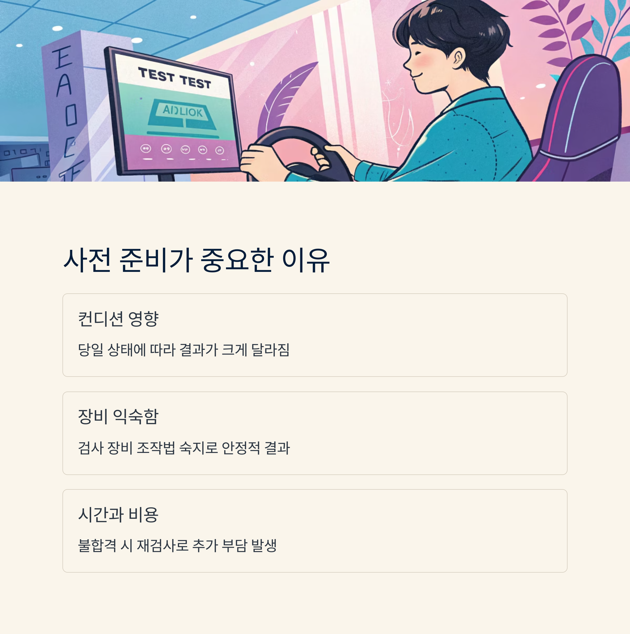 이렇게 항목별 특성에 맞춰 미리 준비해두면 검사를 훨씬 자신감 있게 볼 수 있어요. 특히 처음 검사를 받는 분들이나 장시간 운전 경험이 적은 분들은 실제 테스트와 유사한 방식의 시뮬레이터 연습도 추천해요. 준비한 만큼 결과가 나오는 검사인 만큼, 본인의 패턴을 잘 파악해서 준비해보세요! 🧠