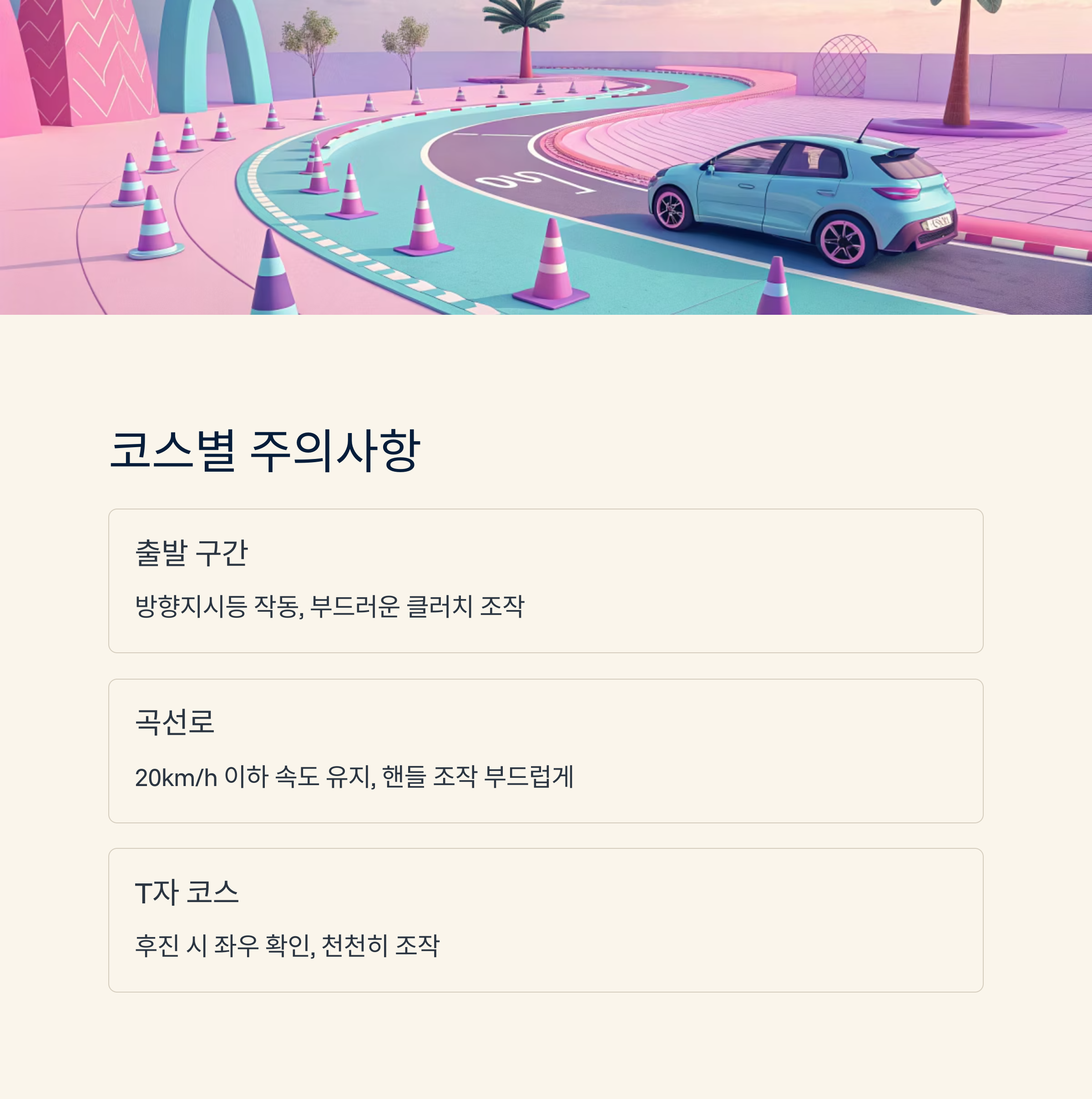 각 구간의 특성을 정확히 이해하고 예상 상황을 대비해 연습하면 감점 없이 깔끔하게 코스를 통과할 수 있어요. 📚