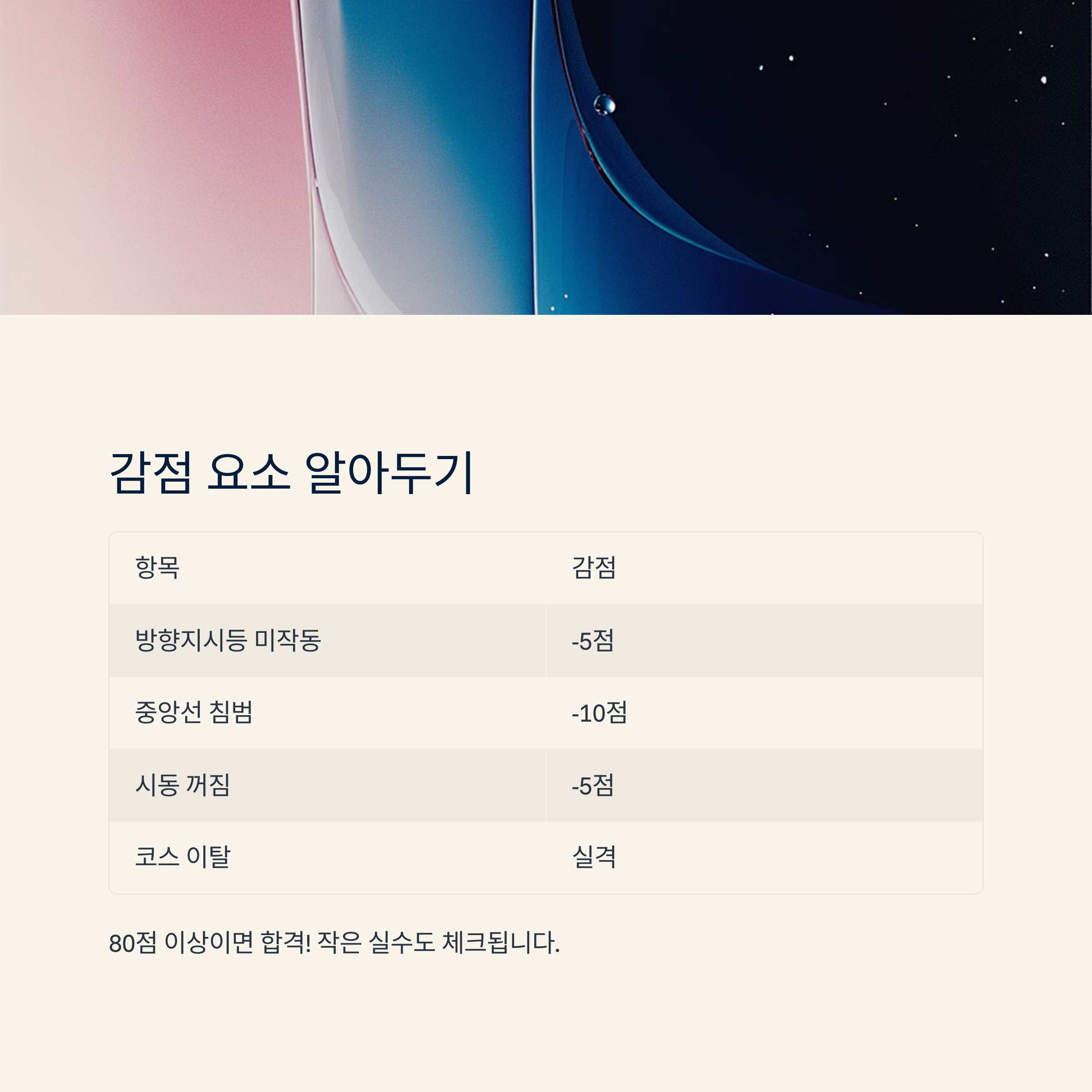 예를 들어, 방향지시등을 켜지 않고 진입하면 5점 감점, 곡선로에서 차선을 벗어나면 10점 감점이에요. 하지만 출발선 미준수, 코스 이탈, 안전벨트 미착용 같은 항목은 한 번만 해도 실격이 될 수 있어요.