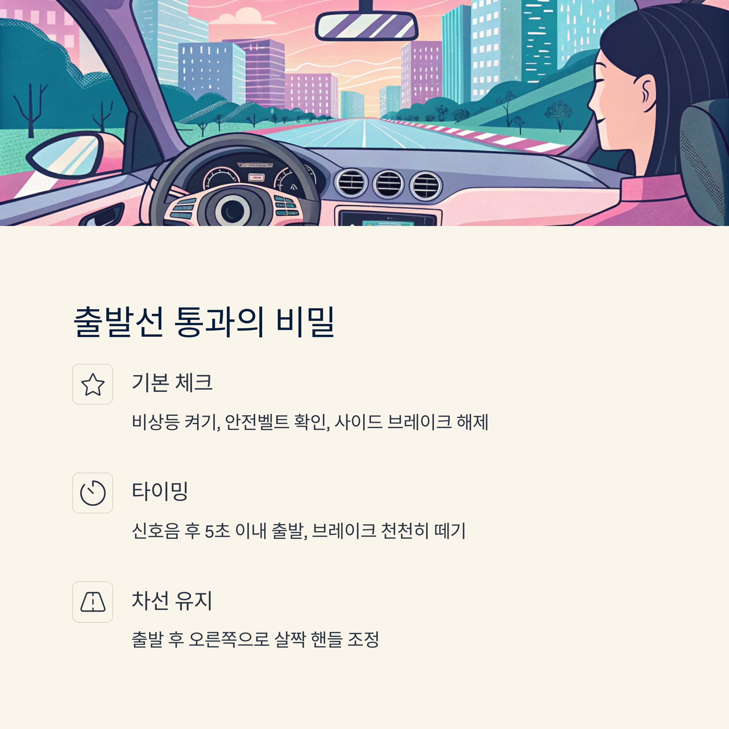 출발은 단순해 보이지만 가장 중요한 순간이기도 해요. 이 단계를 차분히 통과해야 다음 코스에서도 자신감이 생기거든요. 시험 전날 미리 출발 연습을 반복하면서 몸에 익히는 걸 추천해요! 😊