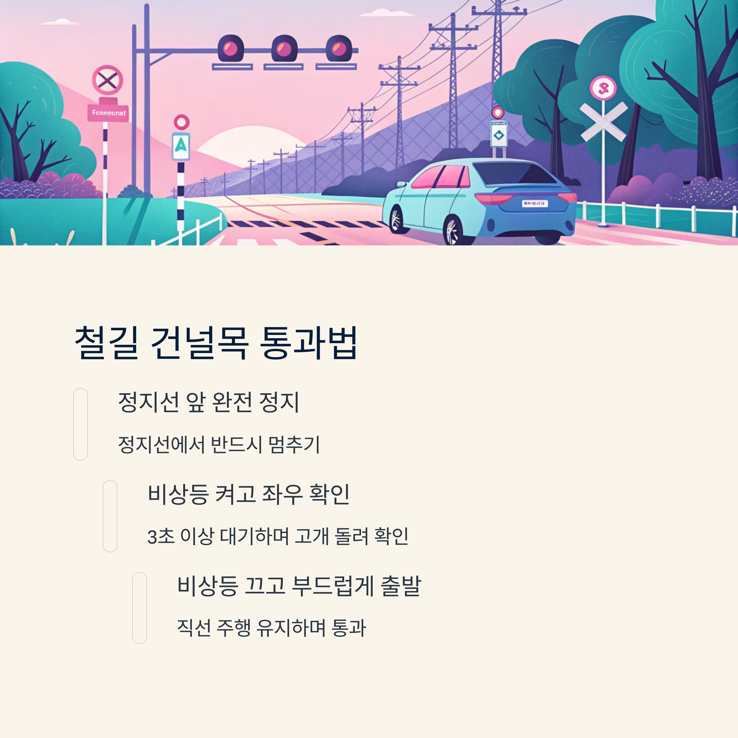 정지 후에는 비상등을 끄고 천천히 출발해요. 출발 시 갑자기 튀지 않도록 부드럽게 가속페달을 밟아야 해요. 철길 건널목을 지나면서 핸들을 좌우로 흔드는 경우가 있는데, 핸들은 고정한 채 직선 주행을 유지하는 것이 중요해요.