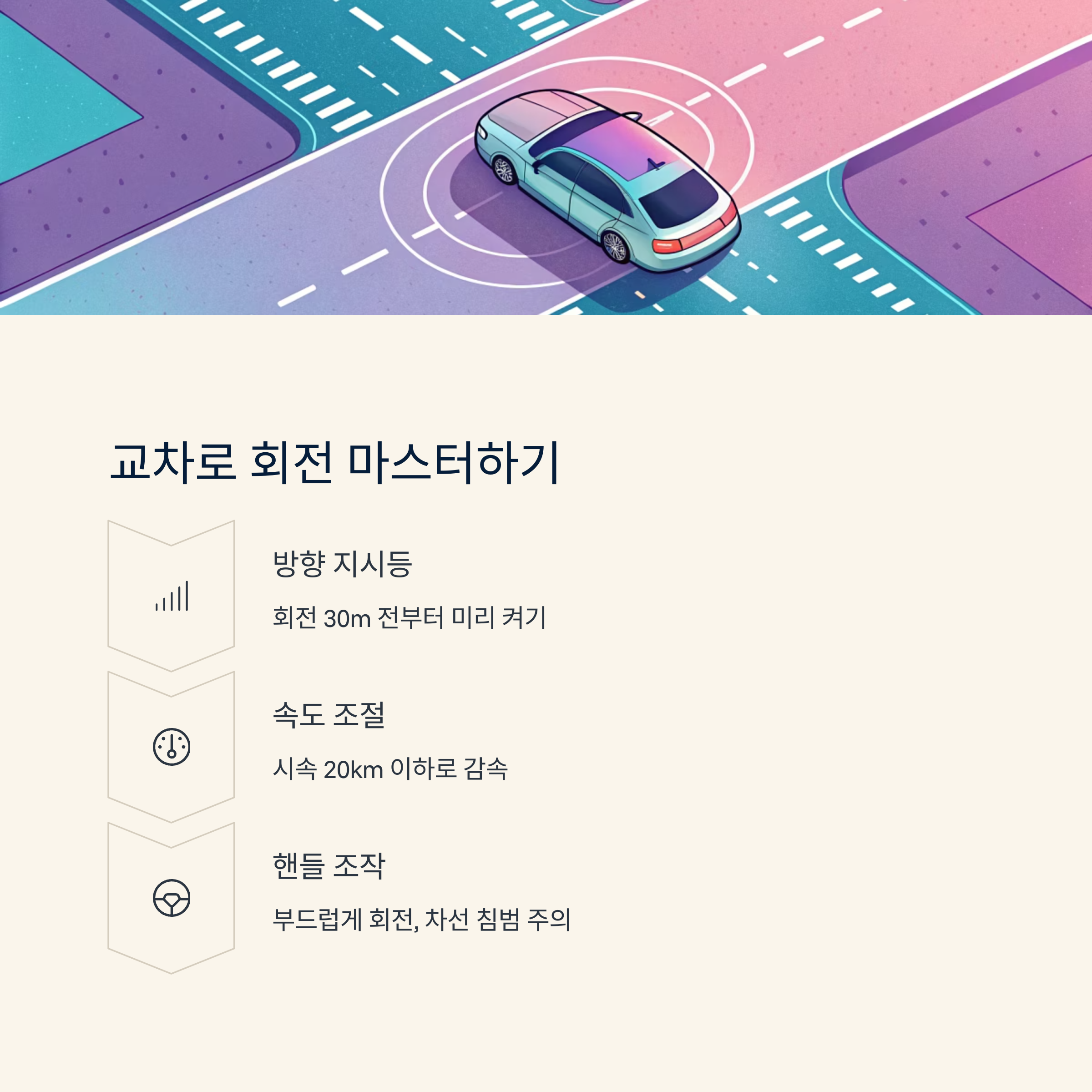 교차로에서는 무조건 정지하거나 급브레이크를 밟는 것이 아니라, 차량 흐름에 맞춰 자연스럽게 통과하는 것이 중요해요. 시속 20km 이하로 유지하며 회전 시 좌우를 확인하는 동작도 자연스럽게 보여주는 것이 좋아요.