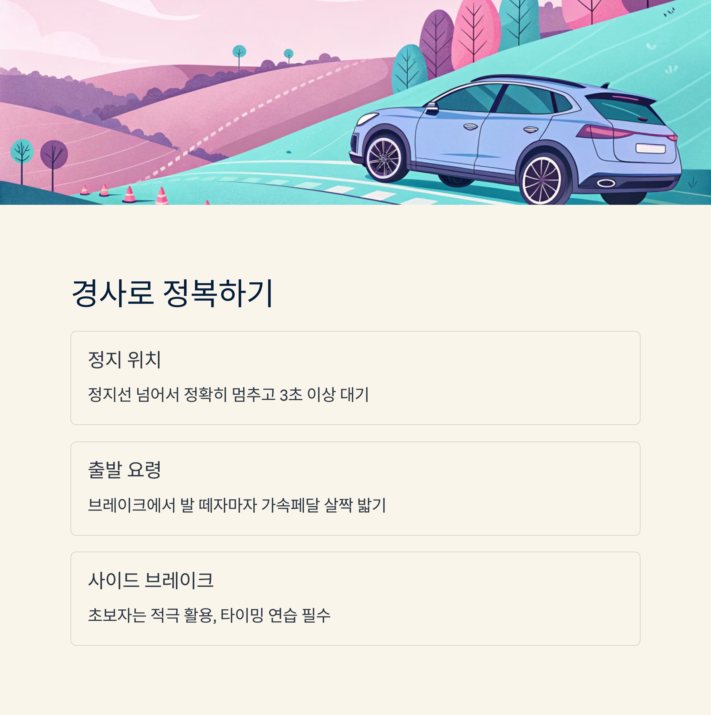 경사로는 연습을 많이 할수록 자신감이 생겨요. 특히 초보자는 사이드 브레이크를 적극적으로 활용하는 것도 좋은 방법이에요. 시험장에서 차량이 뒤로 밀리지 않도록 대비하는 게 가장 중요해요!