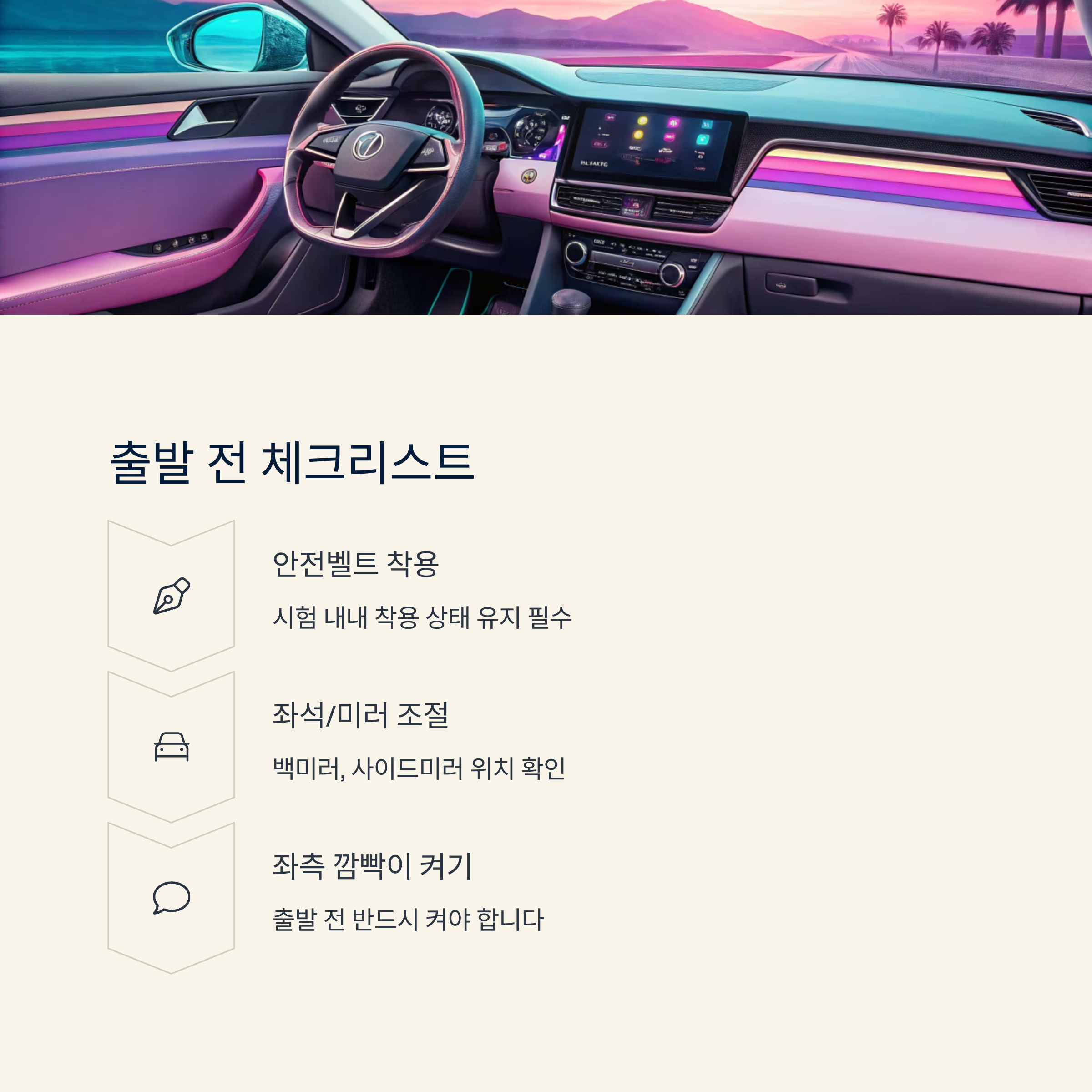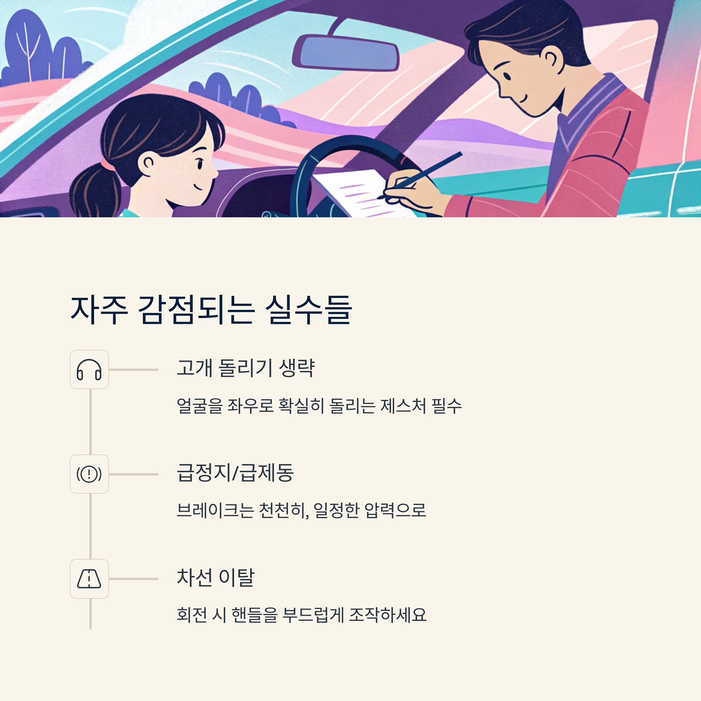 시험장에서 자주 발생하는 실수를 다시 한 번 메모장에 정리하고, 침대 옆에 놓고 보면 심리적 안정에 도움이 돼요. 깜빡이, 사이드 브레이크, 고개 돌리기, 안전거리 유지 등을 한 번 더 체크해보세요.