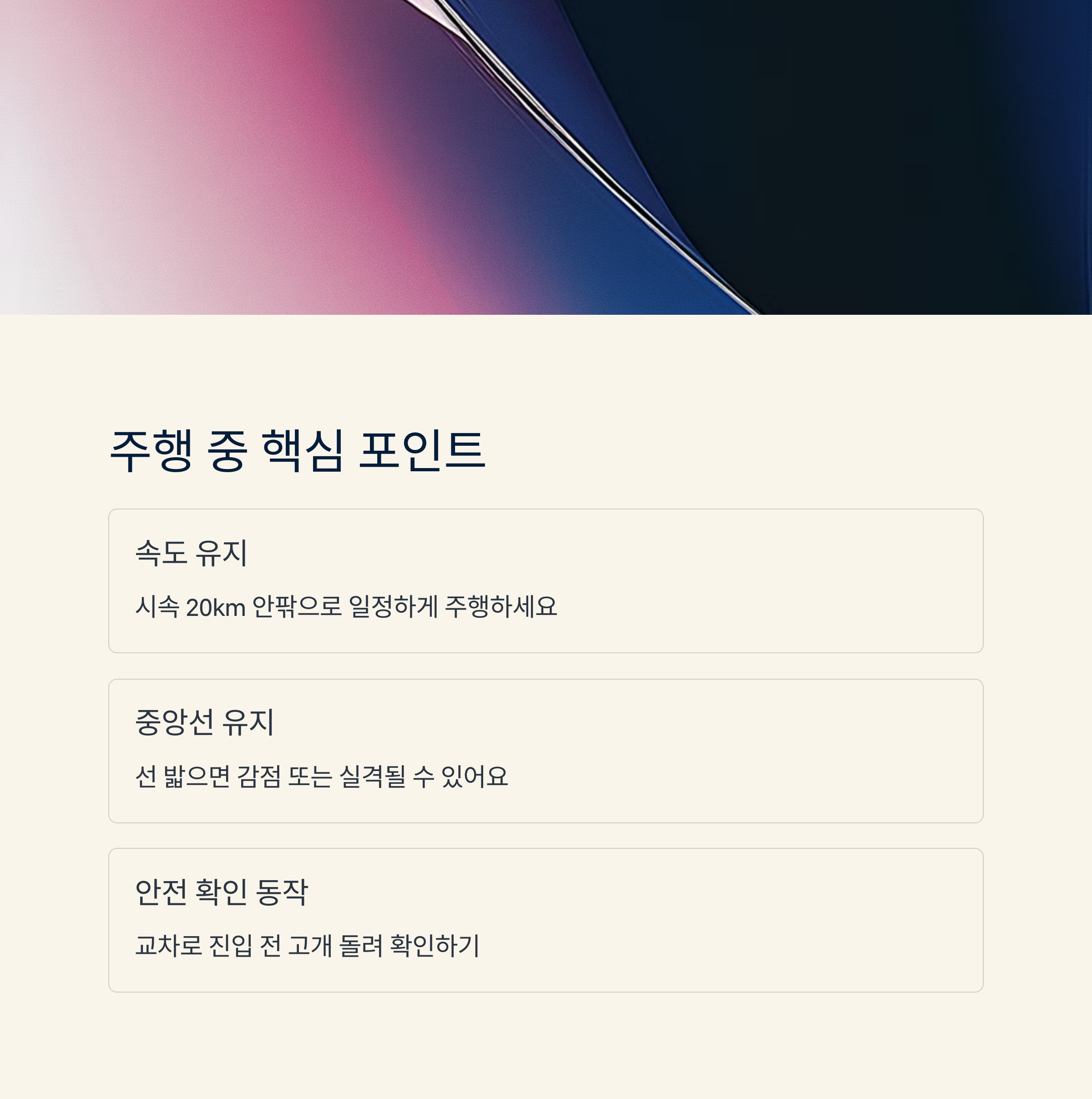 교차로에 진입하기 전에는 고개를 좌우로 돌려서 안전 확인을 하는 동작을 보여주는 게 포인트예요. 이건 실제로 감독관이 많이 체크하는 부분이기 때문에 습관처럼 몸에 익혀두면 좋아요.