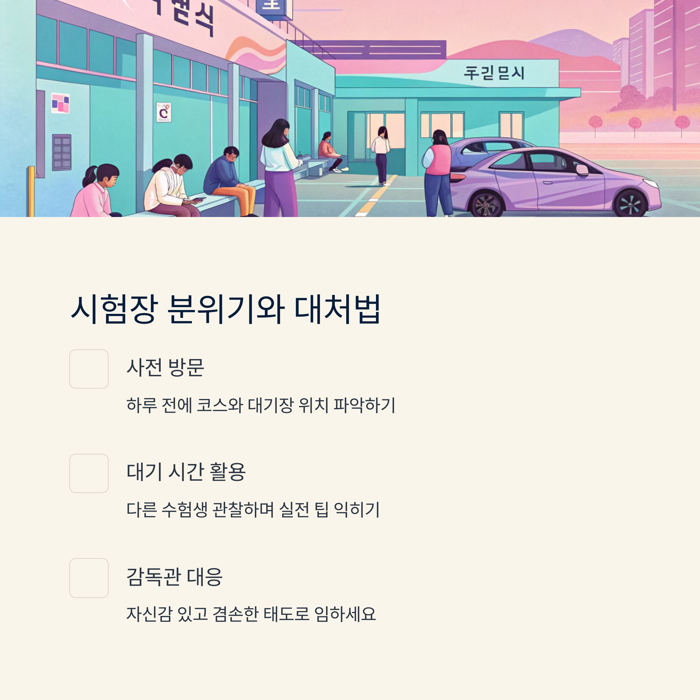 시험장은 생각보다 많은 수험생들이 대기하고 있어서 긴장감이 감돌아요. 하지만 대부분의 수험생들이 비슷한 불안감을 갖고 있기 때문에, 미리 현장 분위기를 파악해두면 훨씬 마음이 편해져요. 가능한 한 시험 하루 전에 방문해 코스나 대기장 위치를 눈에 익히는 걸 추천해요.