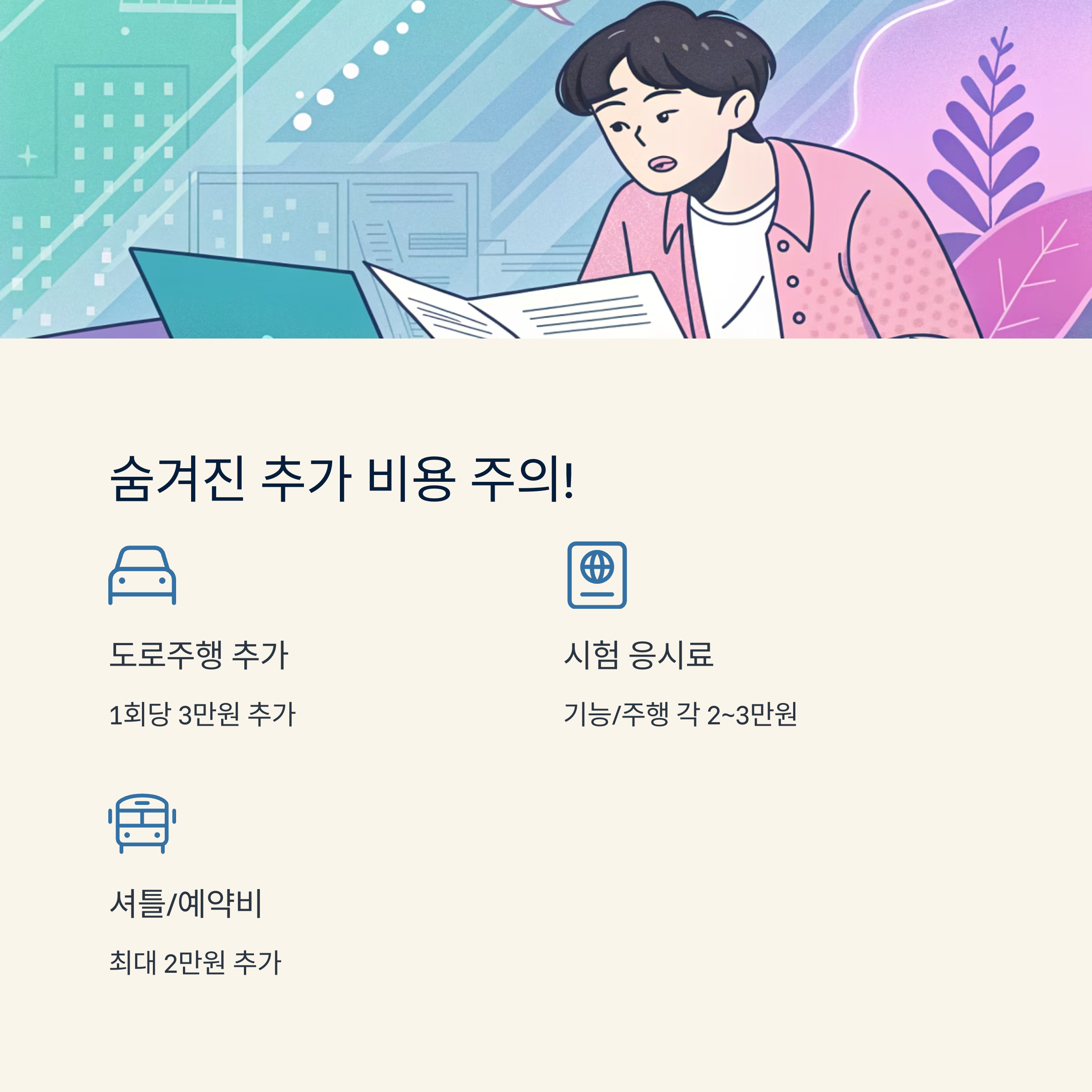 가장 대표적인 건 '도로주행 추가 비용'이에요. 보통 도로주행은 기본 횟수 6~10회가 포함되어 있지만, 추가 연습이 필요할 경우 1회당 3만 원씩 별도 지불해야 하는 구조가 많답니다.