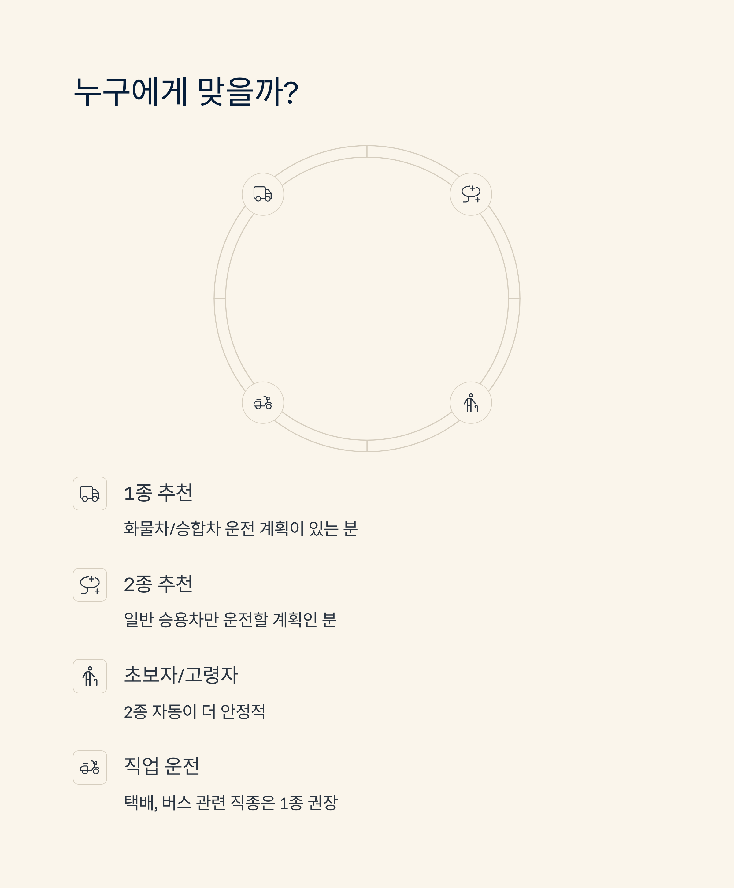 고령자나 운전 경험이 거의 없는 분이라면 난이도가 낮고, 기어 조작이 필요 없는 2종 자동이 안정적이에요. 시간 절약도 되고, 합격률도 높은 편이니까요.