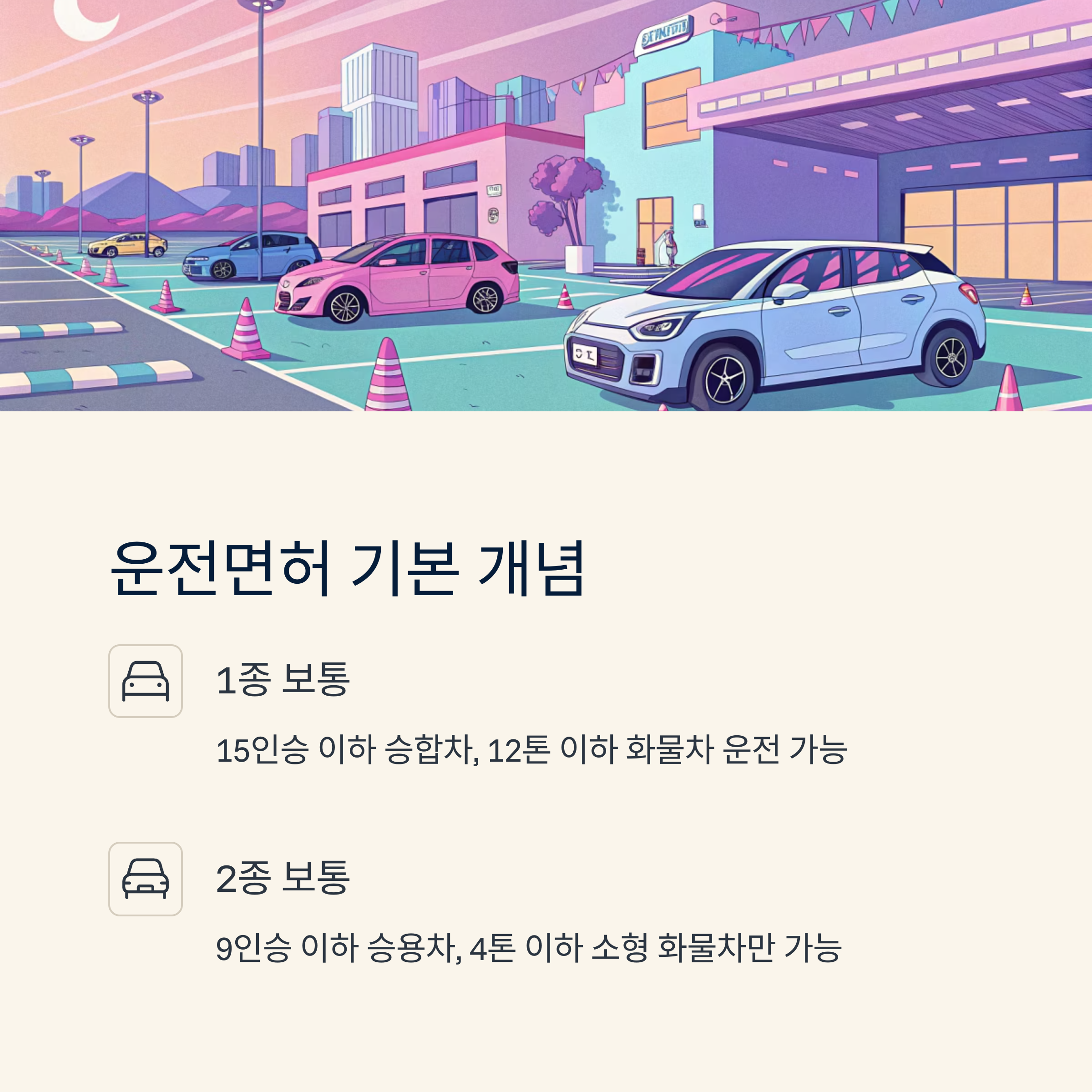 1종 보통은 15인승 이하 승합차, 12톤 이하 화물차까지 운전할 수 있어요. 반면, 2종 보통은 오로지 9인승 이하 승용차와 4톤 이하의 소형 화물차만 가능해요. 이 차이가 운전면허 선택의 가장 큰 기준이 되죠.