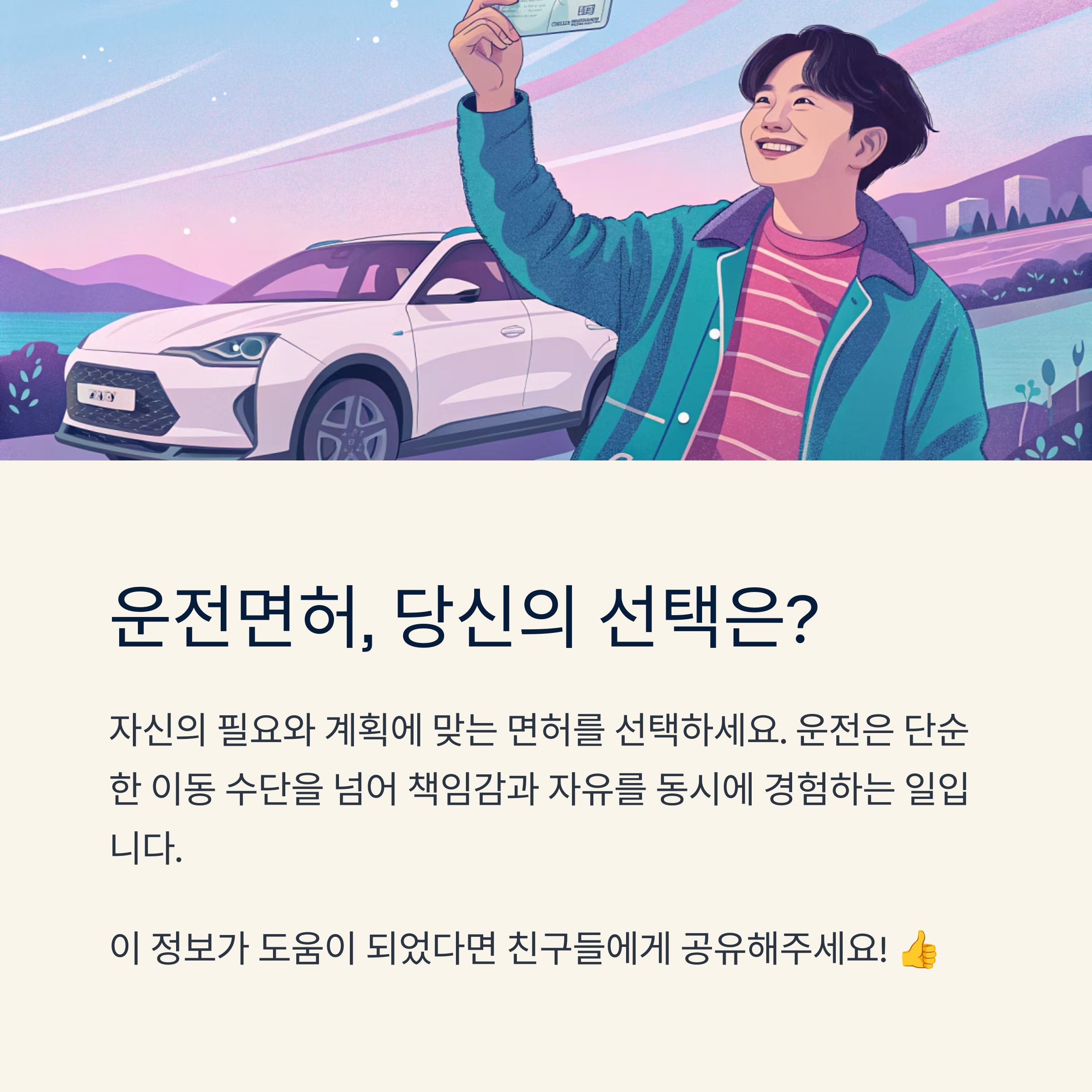 결론적으로, 직업적으로 차량을 운전할 일이 있거나 다용도로 면허를 활용하고 싶다면 1종! 평소엔 가볍게 승용차만 탈 예정이라면 2종 자동이 제격이에요. 😄