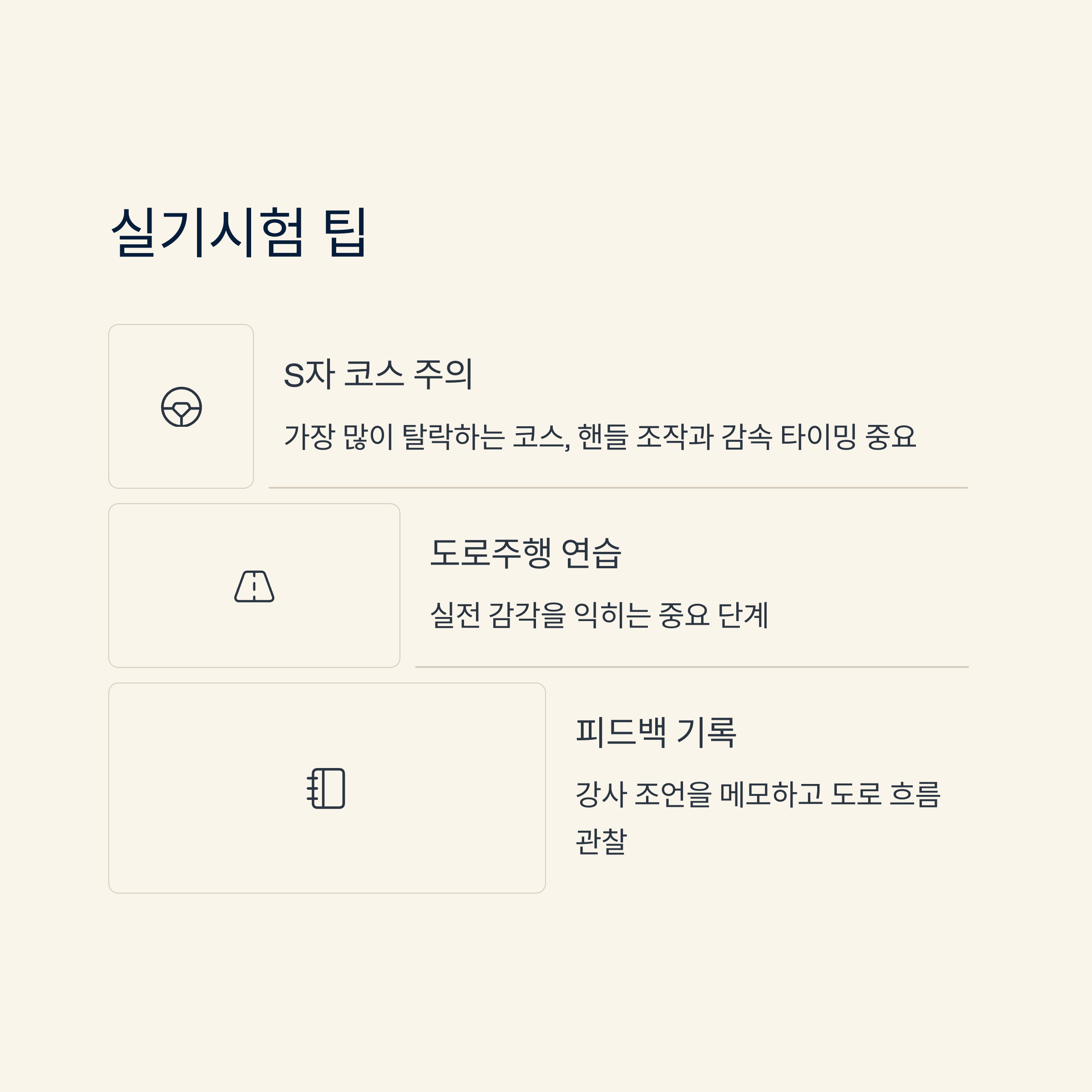 학원에서 연습할 때는 강사가 주는 피드백을 바로바로 메모하고, 도로 흐름을 관찰하는 눈을 길러야 해요. 실전 감각은 연습으로부터 나오는 법이죠! 👀