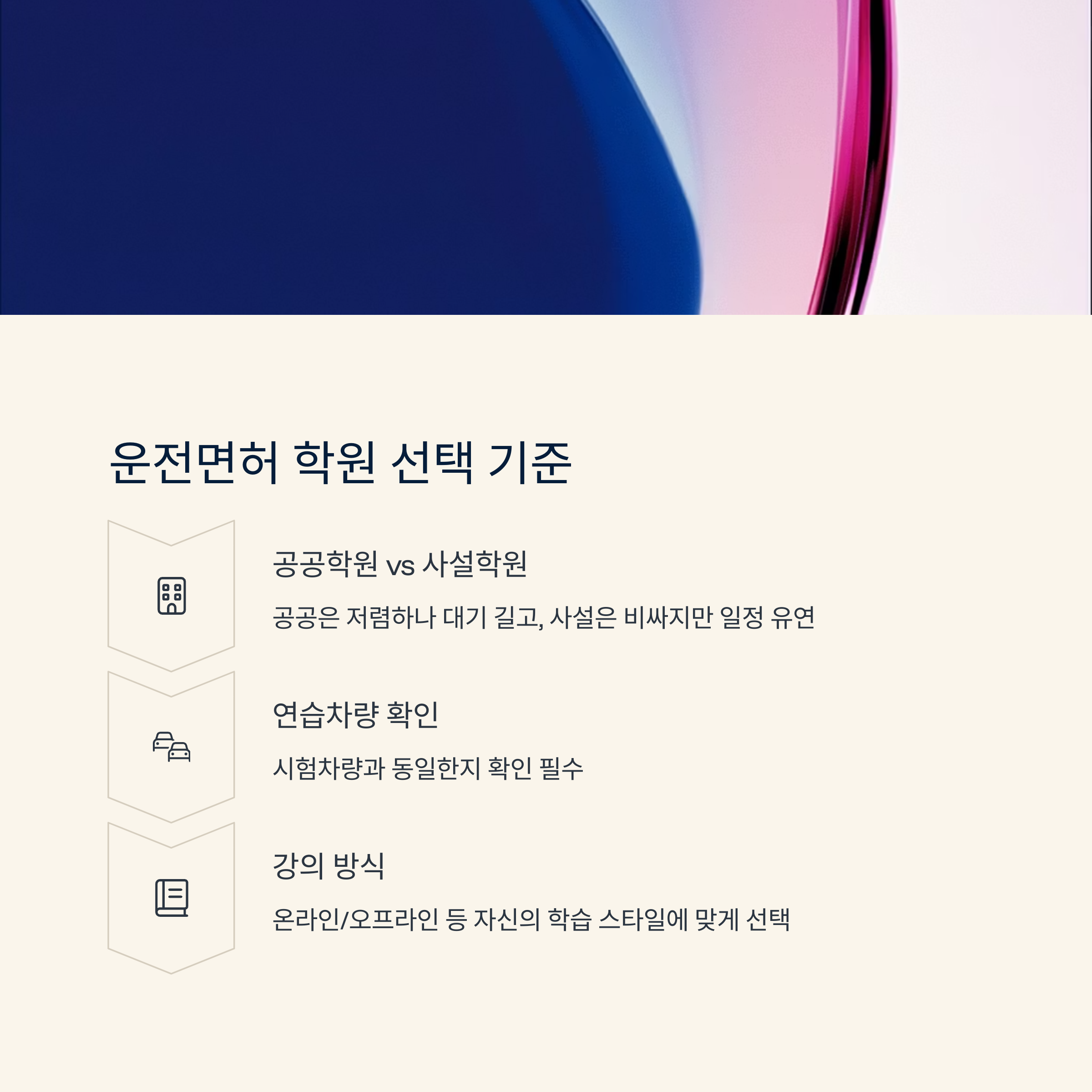 우선 공공학원과 사설학원의 차이를 알아두는 게 좋아요. 공공학원은 비교적 저렴하지만, 대기 인원이 많아 시험 일정이 오래 걸릴 수 있어요. 반면 사설학원은 가격이 좀 비싸지만 수강 스케줄 조정이 유연하고 빠르게 시험을 볼 수 있다는 장점이 있죠.