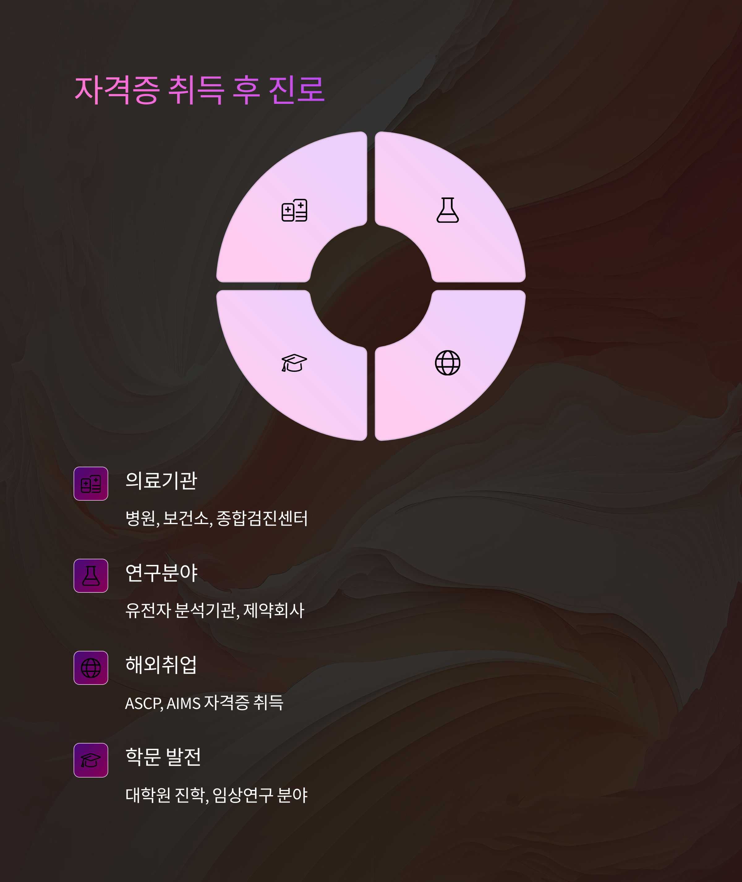 해외 취업을 노리는 경우에는 미국의 ASCP 자격증, 호주의 AIMS 인증 등을 따로 준비할 수도 있어요. 영어와 관련 자격 기준을 충족해야 하지만, 국내보다 근무 환경이나 처우가 더 나은 경우도 많아서 도전해볼 만해요.