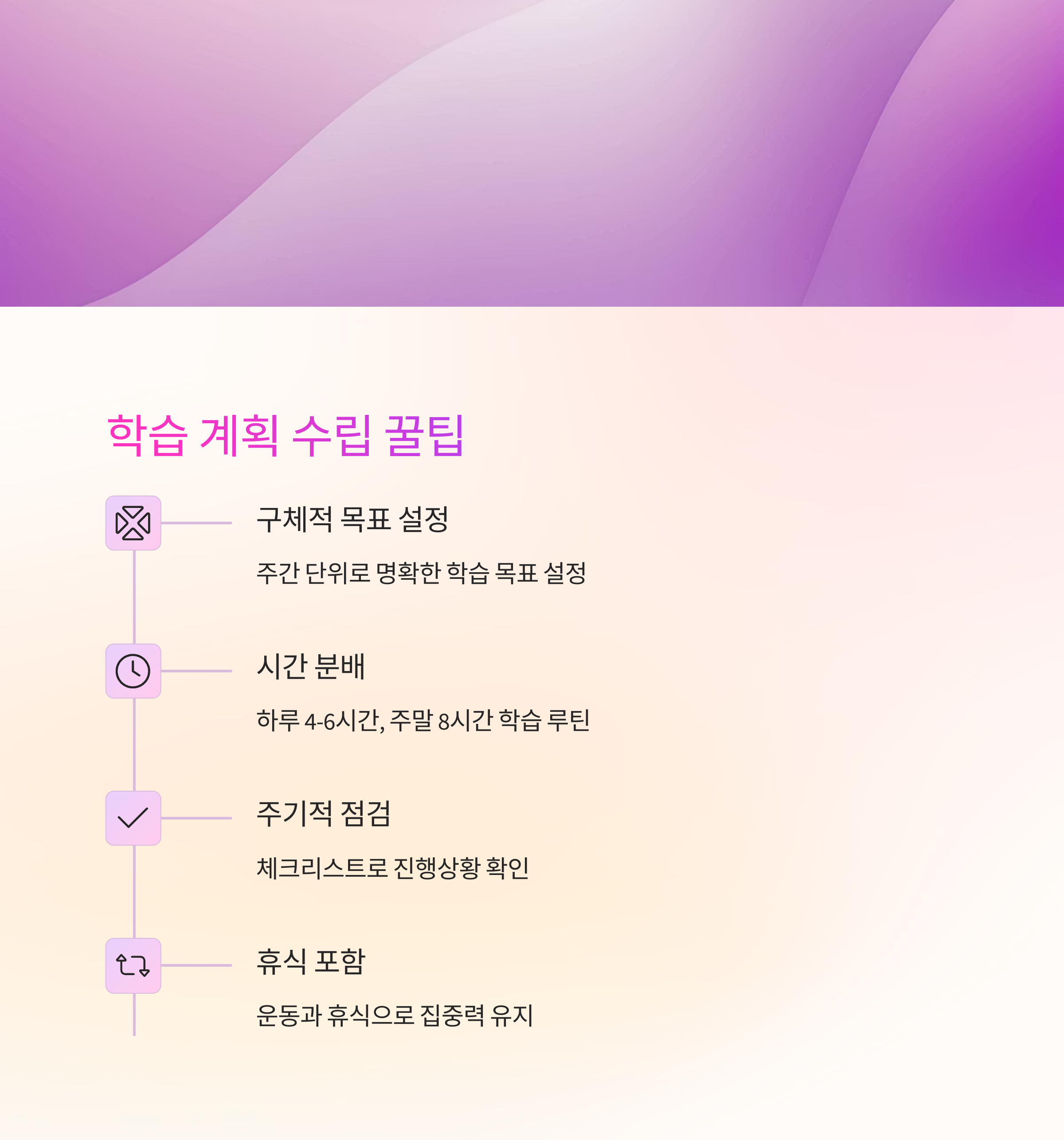 무리한 계획은 절대 금물이에요. 공부할수록 지치기 쉬우니 중간중간 휴식 시간을 넣고, 운동이나 산책도 포함시켜보세요. 리프레시가 잘 되어야 장기적으로 집중력도 유지할 수 있답니다 😌