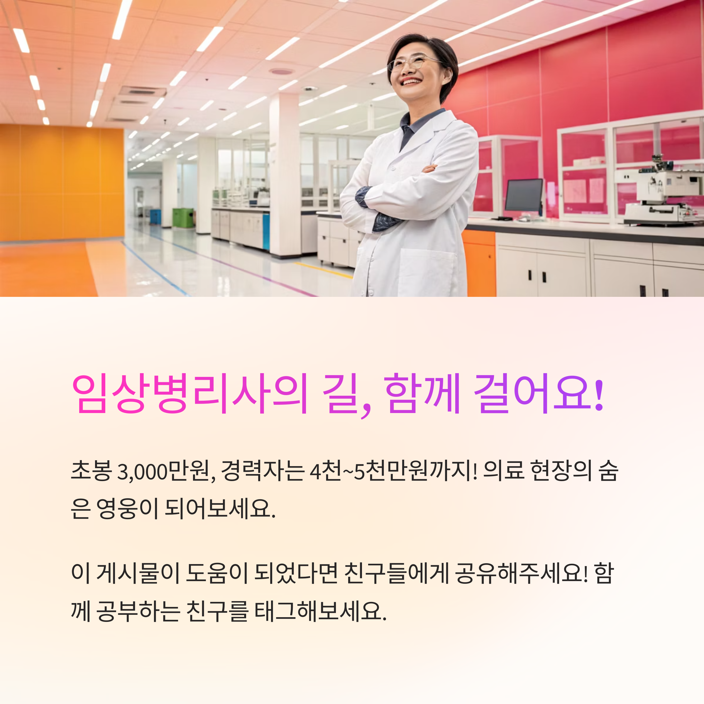 또한 최근에는 대학원 진학을 통해 의과학 연구자, 임상연구코디네이터(CRC), 임상시험모니터(CRA) 등으로 진출하는 사람도 많아졌어요. 임상병리 지식을 기반으로 한 다양한 확장 진로를 탐색해 보는 것도 좋은 선택이에요.