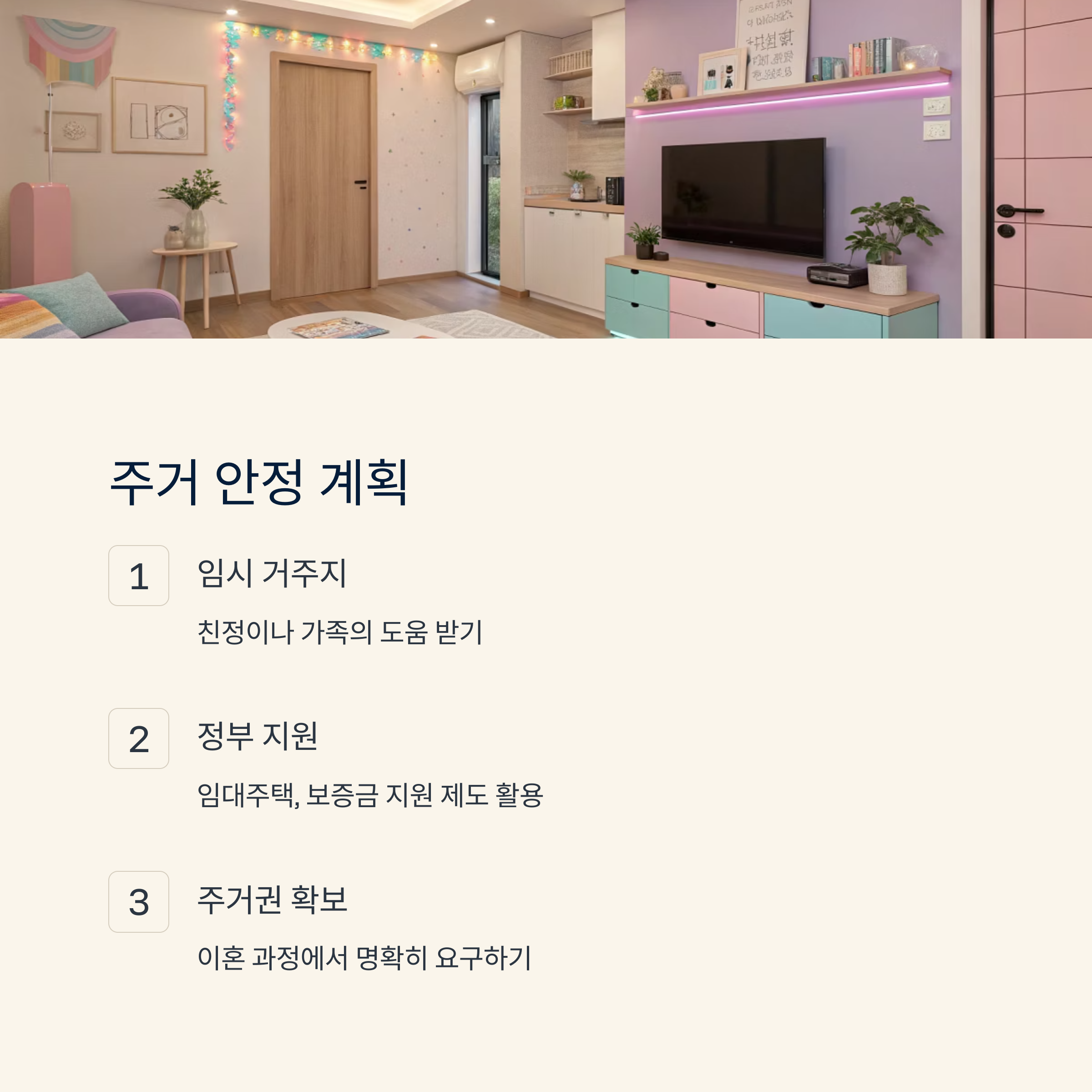 이혼 후 어디에 거주할 것인지도 철저히 계획해야 해요. 거주지는 자녀의 학교 접근성, 경제적 상황, 직장 접근성 등 여러 요소를 고려해서 결정해야 해요. 당장 거주할 곳이 없는 경우 친정이나 가족의 도움을 임시로 받을 수도 있어요. 장기적으로는 독립적 주거 공간을 마련하는 것이 필요해요.