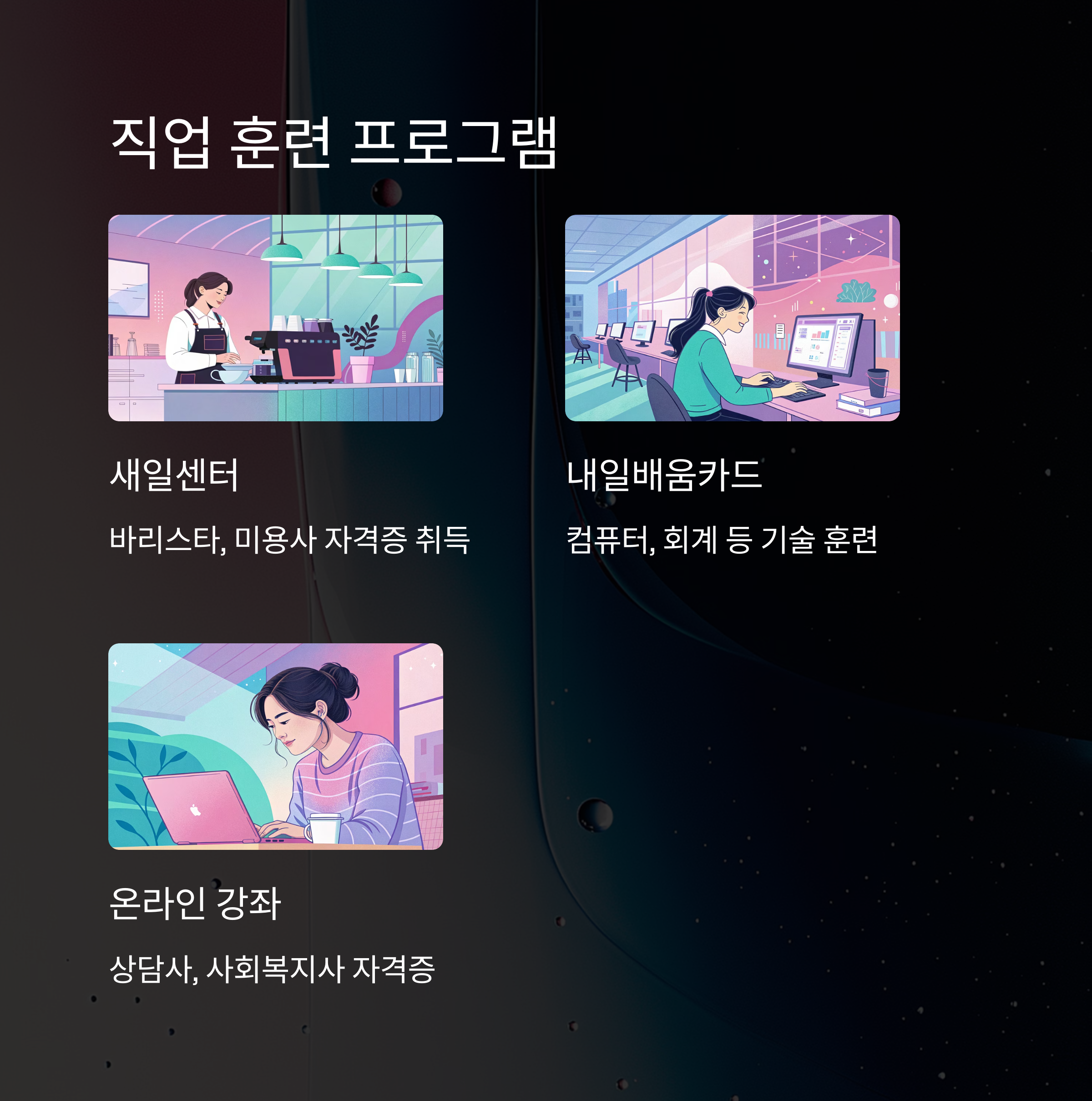 | 새일센터 취업지원 | 직업상담 및 훈련 지원 | 여성가족부 | 3~6개월 | 바리스타, 미용사 등 |
