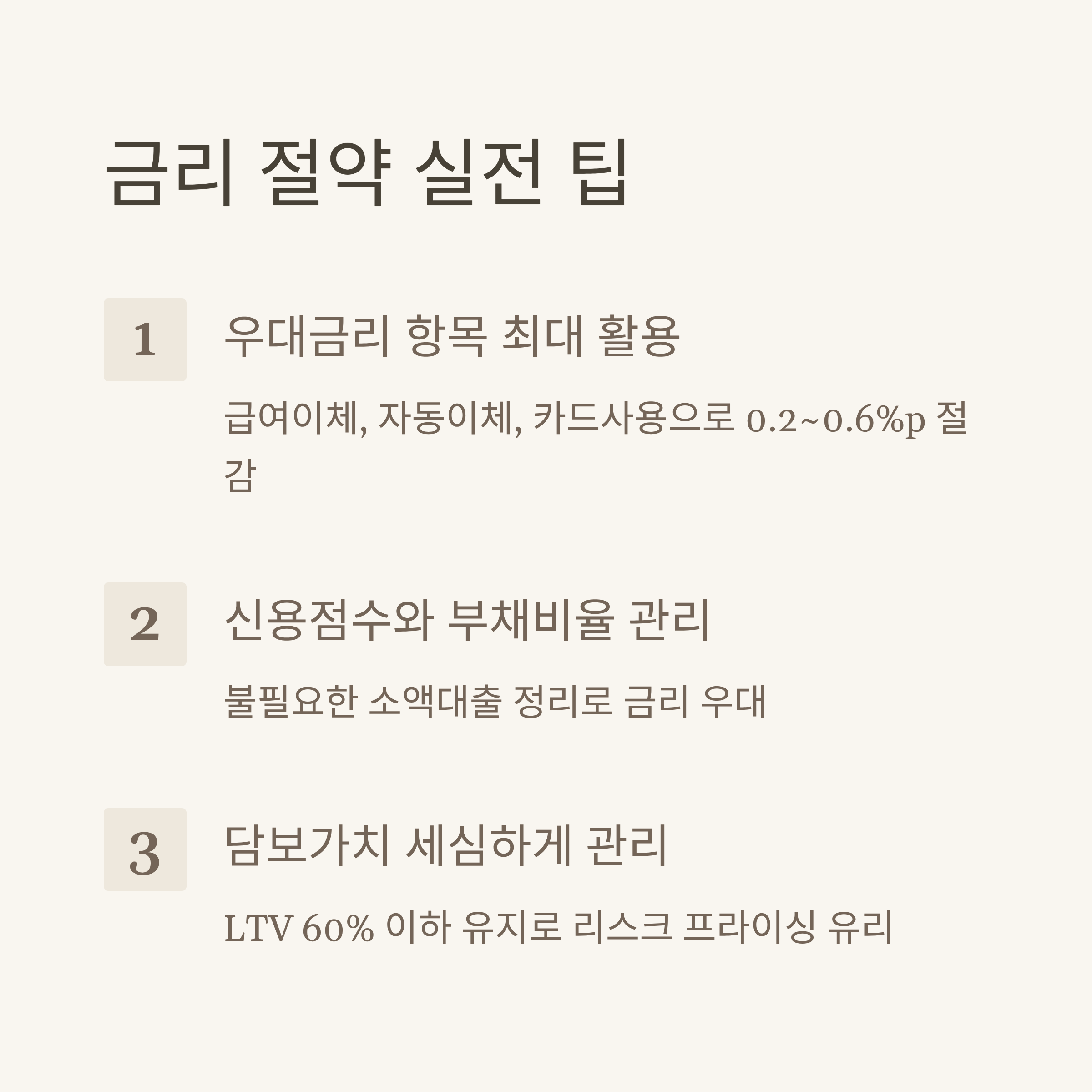 셋째, LTV·담보가치를 세심하게 관리해요. 동일한 금리 조건이라도 LTV 60% 구간과 70% 구간은 리스크 프라이싱이 달라질 수 있어요. 가능한 한 초기 자기자본을 조금 더 넣거나, 담보 평가가 유리한 시점·유형을 선택해 경계 구간을 넘지 않도록 설계하면 유리해요. 리모델링 후 평가, 동일 단지의 최근 거래사례 반영 등도 변수가 돼요.