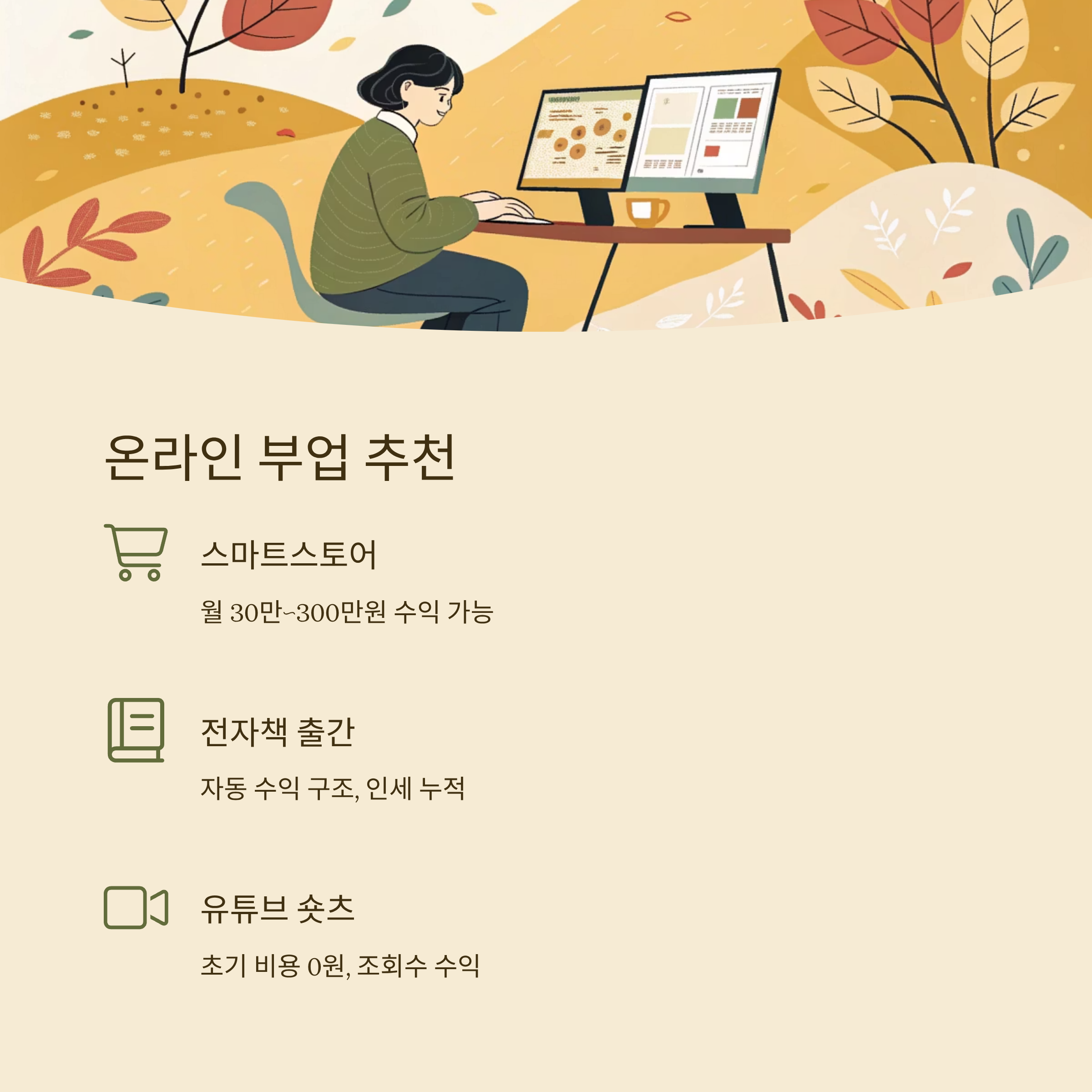대표적인 온라인 부업으로는 스마트스토어, 쿠팡파트너스, 블로그 수익화, 유튜브 숏츠 제작, 전자책 출간 등이 있어요. 처음에는 어렵게 느껴질 수 있지만, 꾸준히 콘텐츠를 올리고 구조를 이해하면 자동으로 수익이 쌓이기도 해요. 특히 전자책은 자신만의 노하우를 담을 수 있는 좋은 방법이에요.