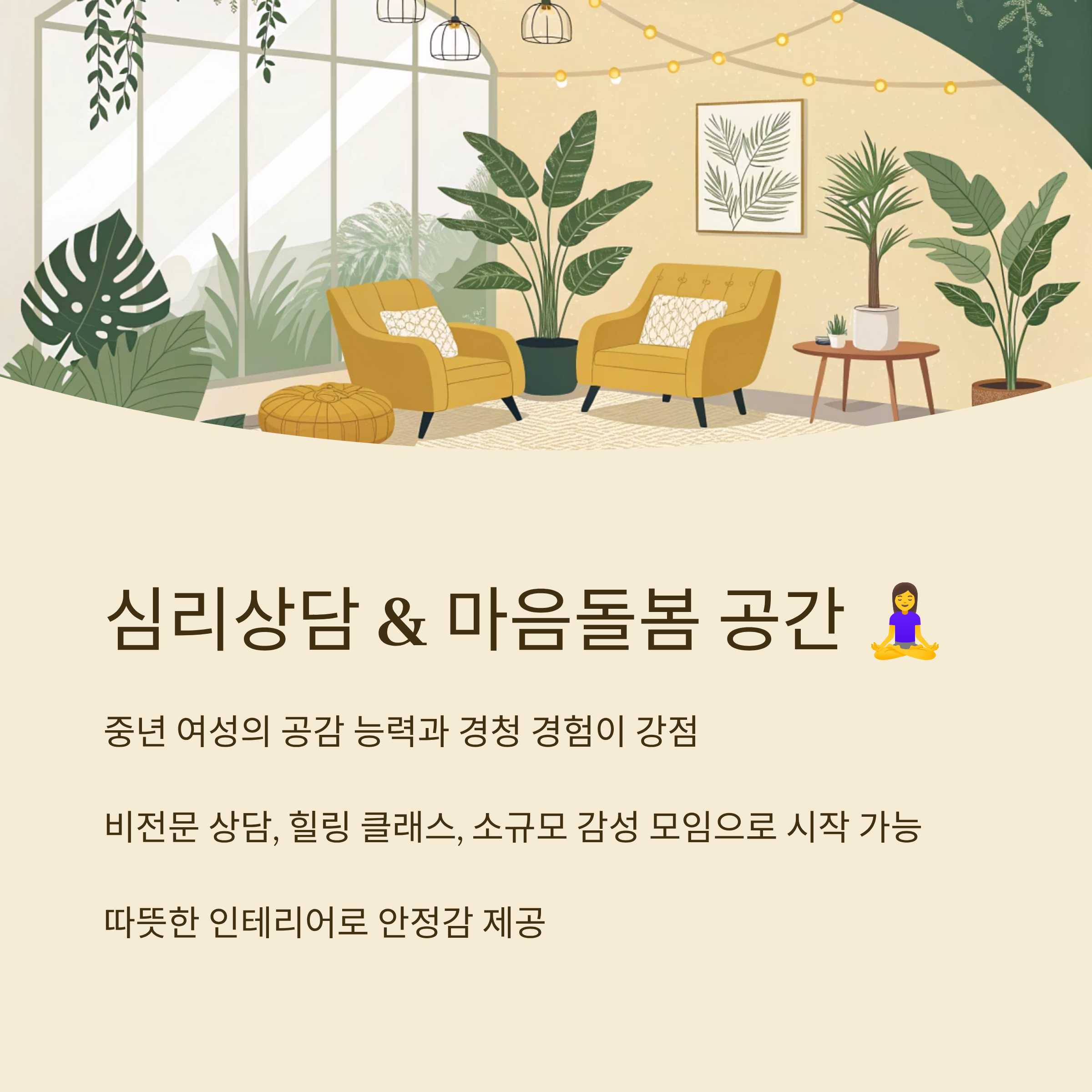중년 여성은 이미 친구, 자녀, 배우자와의 관계 속에서 많은 사람의 이야기를 듣고 공감해온 경험이 있죠. 그 경험이 바로 이 사업의 기반이 되는 거예요. 그리고 상담 공간은 분위기가 아주 중요해요. 따뜻하고 안정적인 인테리어가 상담 효과를 높여줘요.