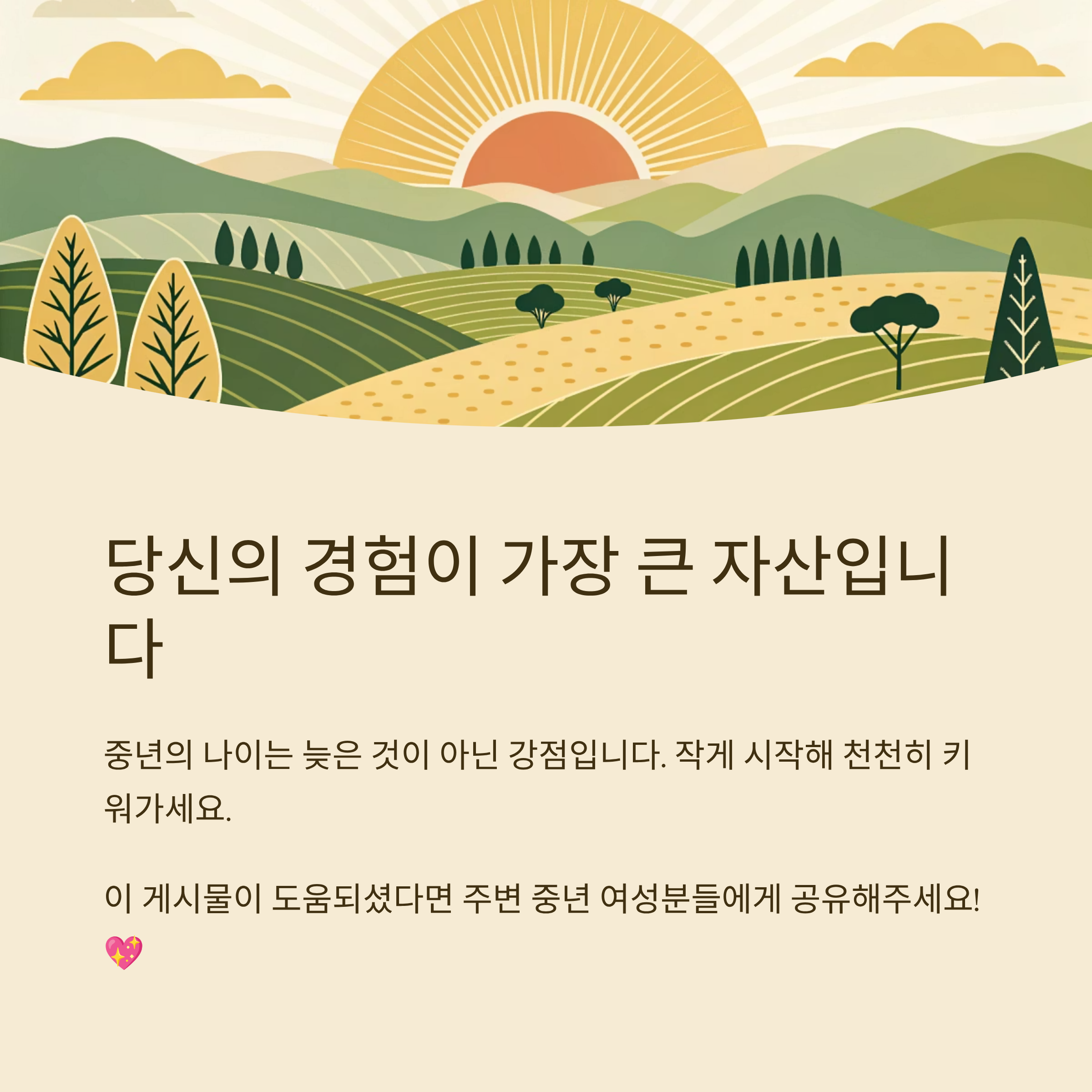 그리고 네 번째로 중요한 건 경험이에요. 중년 여성은 가족, 조직, 사회생활에서 축적된 경험이 풍부해요. 이 경험이 서비스 마인드나 고객 대응 능력, 위기 대처 능력으로 이어져 창업의 강점이 되는 거죠.