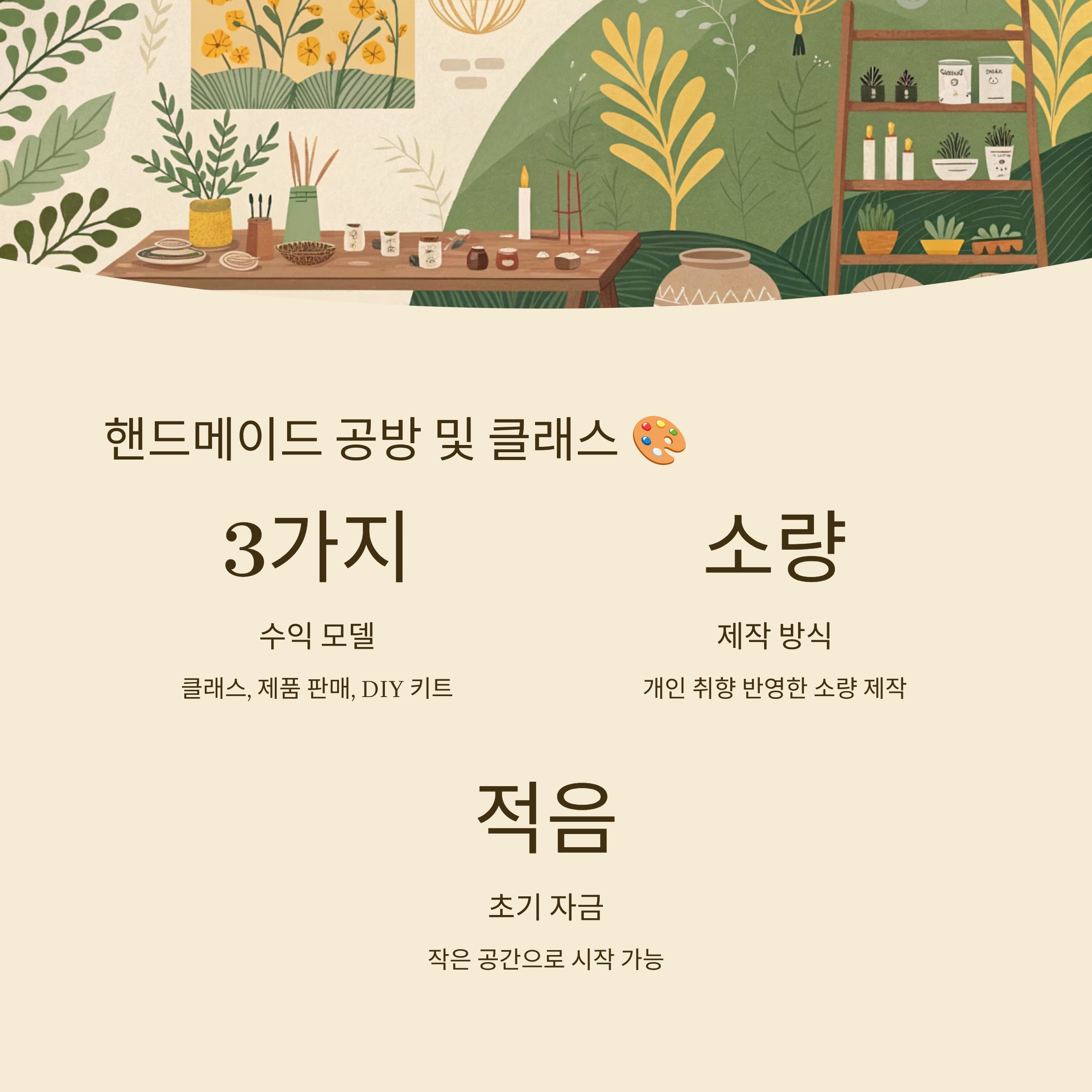 초기 자금도 비교적 적게 들어가고, 작은 공간이면 시작할 수 있어서 부담이 적어요. 무엇보다 공방 운영은 창의성과 즐거움을 함께 줄 수 있어요. 내가 좋아하는 걸 하면서 돈도 벌 수 있는 구조죠. 🎁
