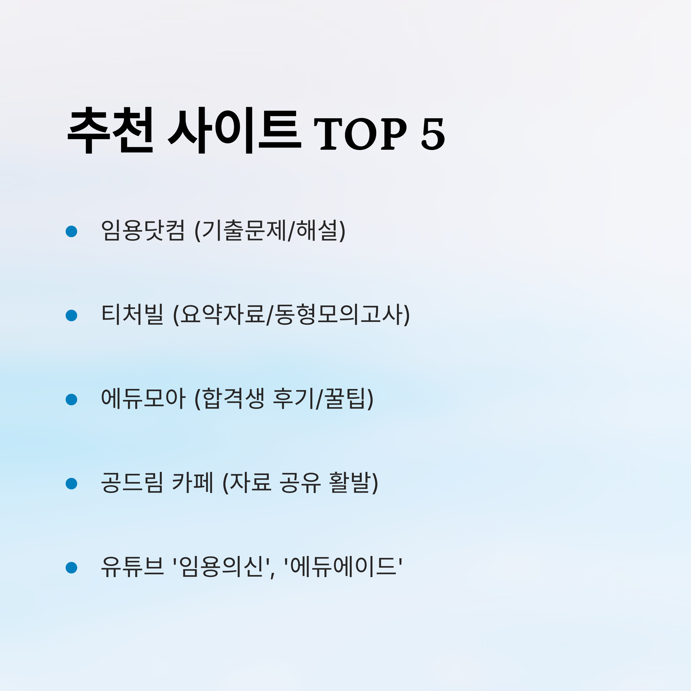 임용 자료를 찾기 좋은 사이트로는 '임용닷컴', '티처빌', '에듀모아', '공드림 카페', '합격의 법칙' 등이 있어요. 이들 사이트는 과목별 기출문제와 해설, 요약 자료, 동형 모의고사, 합격생 후기 등을 제공하죠. 또 유료 프리패스 강의를 듣는 분들은 강사들이 제공하는 교안, 요약 PDF, 심화 해설지를 함께 받는 경우도 많아요.