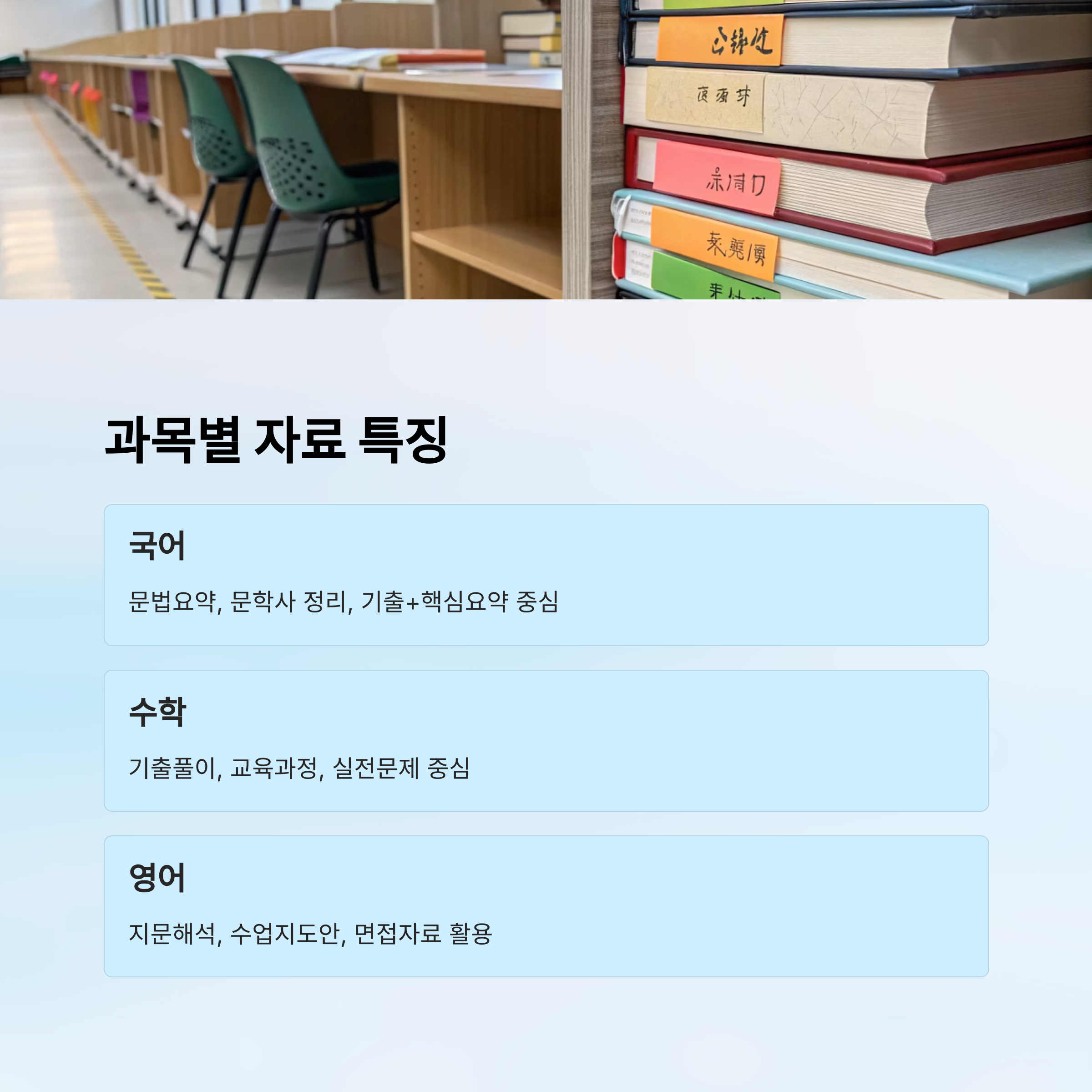 국어, 수학, 영어 같은 주요 과목은 출판사별로 교재도 다양하게 나와 있어요. 하지만 지엽적인 내용보다 출제빈도 높은 핵심 개념 위주로 정리된 자료가 훨씬 효율적이에요. 예를 들어, ‘국어 문법 요약 정리’나 ‘교육과정 연도별 변화 비교표’ 같은 자료들이 실제 시험에서 큰 도움이 돼요.