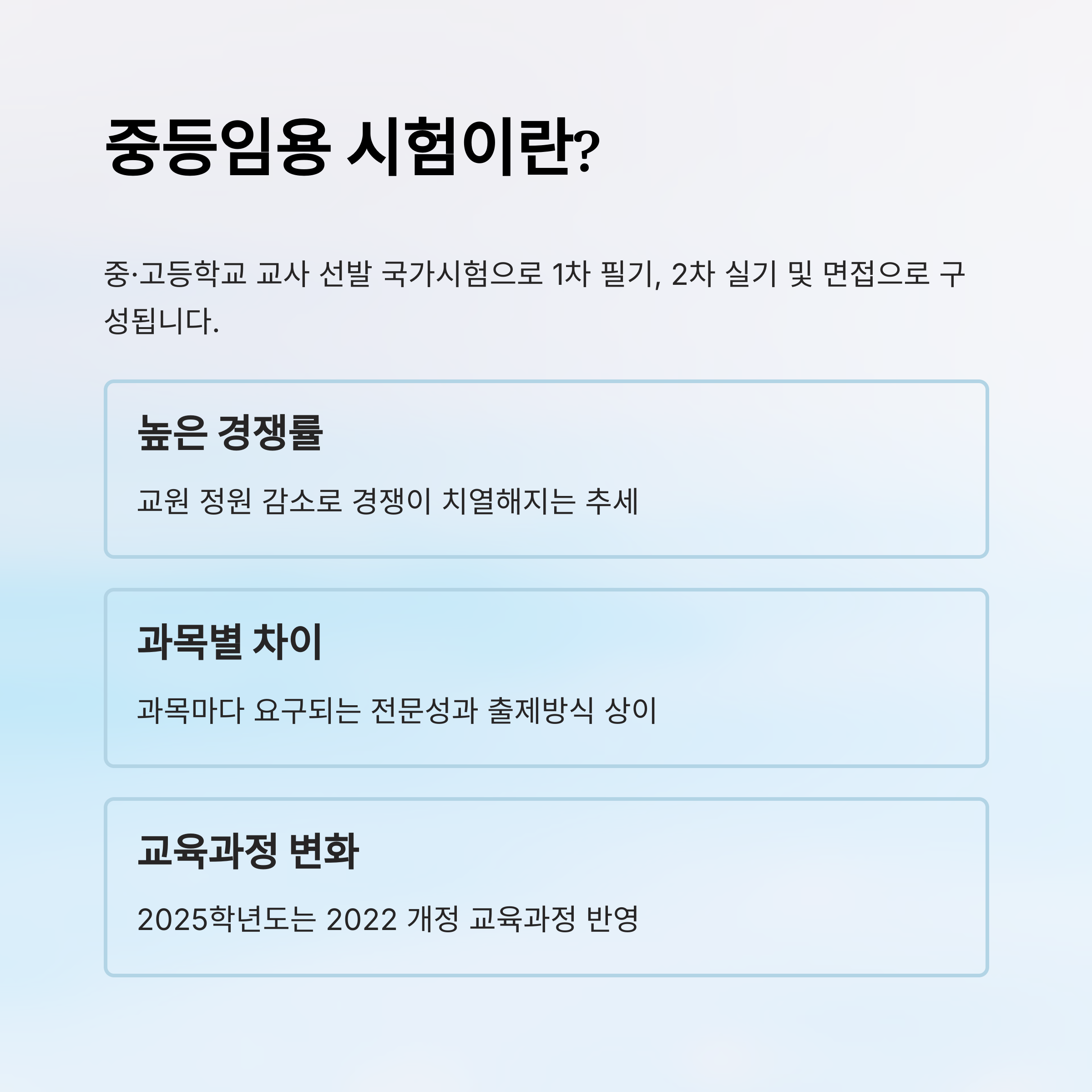 중등임용시험은 중·고등학교 교사를 선발하기 위한 국가시험이에요. 교육부 주관 아래 시도 교육청에서 매년 실시하며, 정해진 응시 과목에 따라 필기와 면접, 수업실연 등 다양한 단계로 나누어져 있어요. 시험은 일반적으로 1차 필기시험과 2차 실기 및 면접으로 구성되며, 과목별로 문제 유형이 다르기 때문에 맞춤형 자료 준비가 중요하답니다.