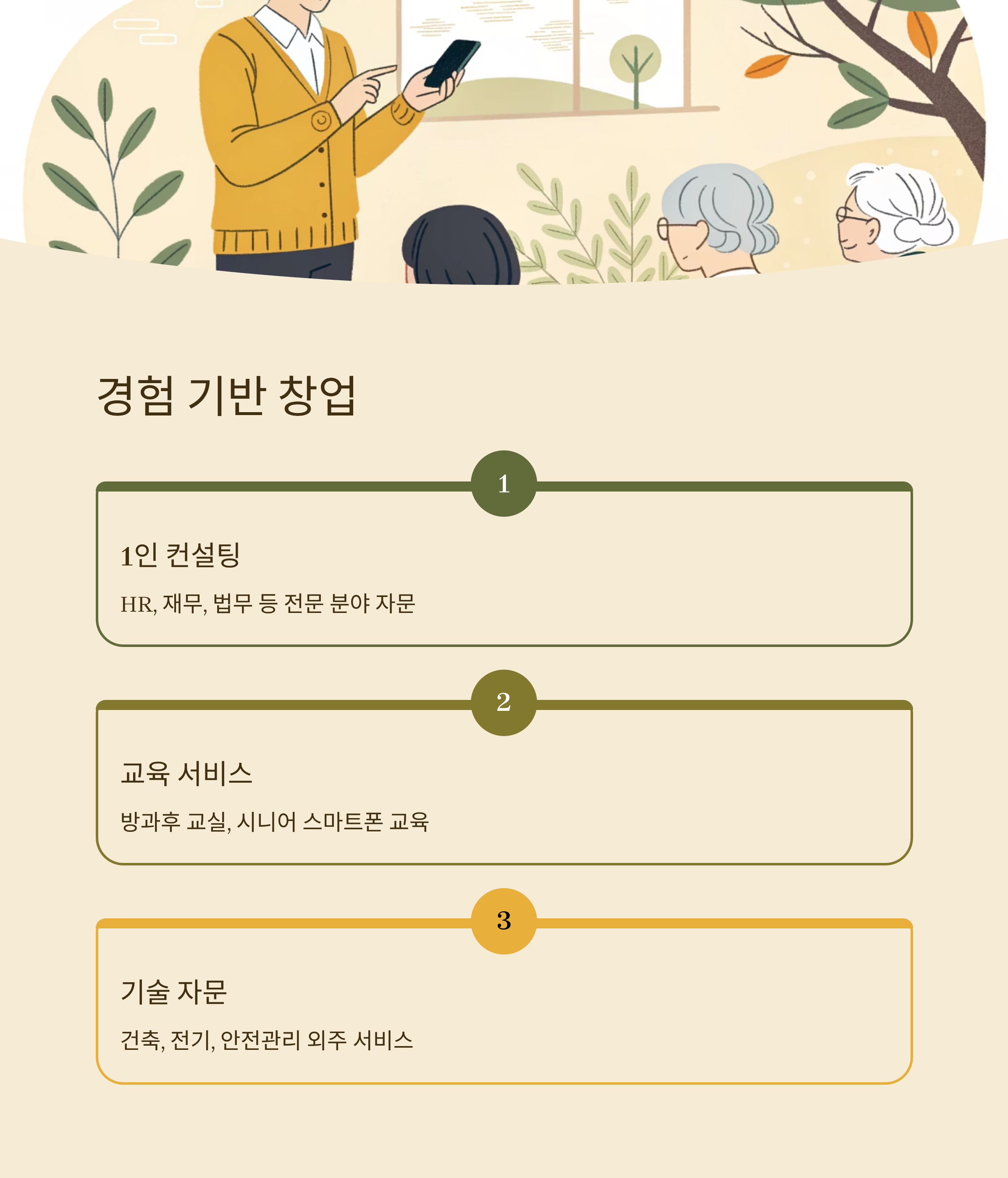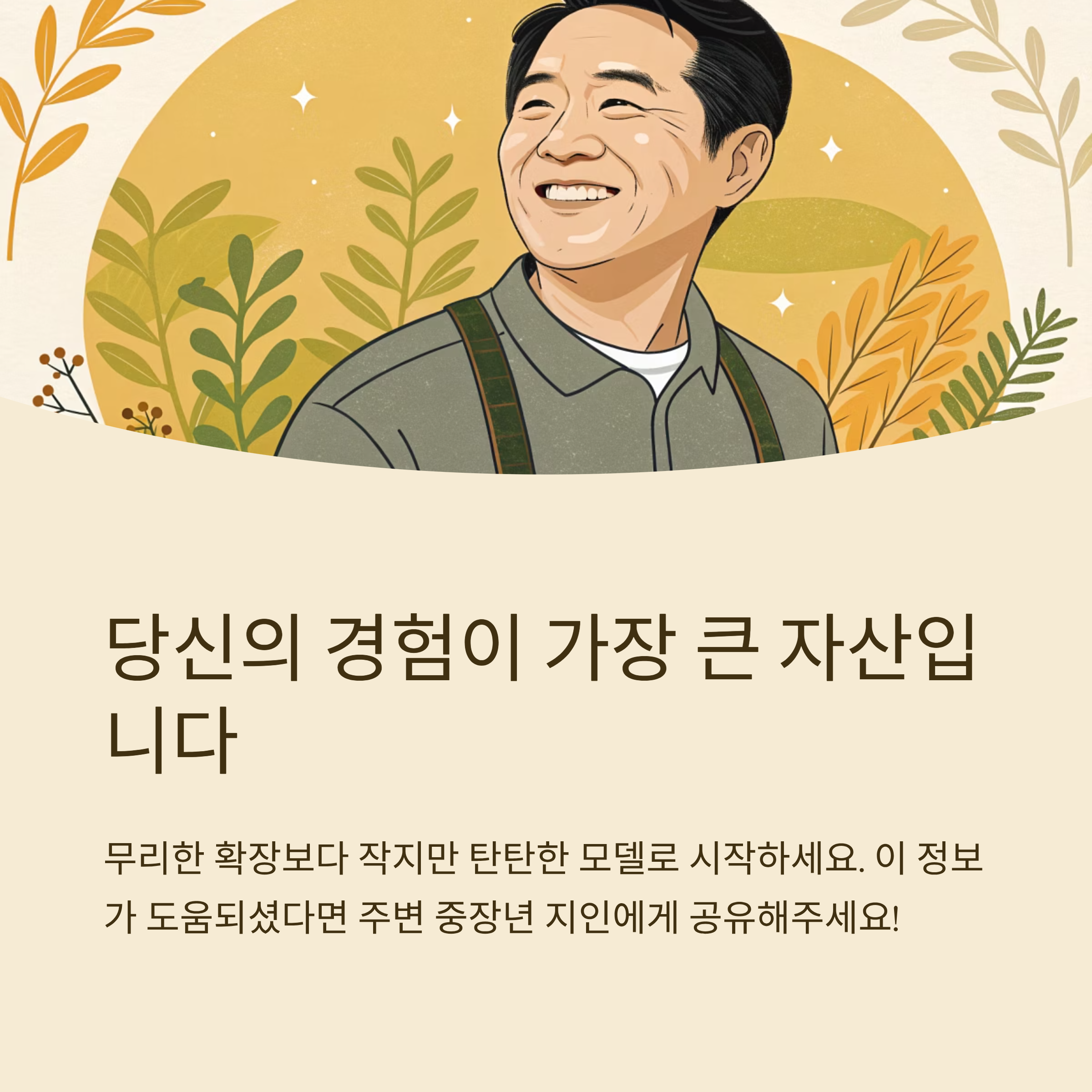 중장년층의 가장 큰 강점은 오랜 기간 쌓아온 경험과 전문성이에요. 단순히 트렌드를 따라가기보다, 내가 해왔던 일, 잘 아는 분야에서 창업 기회를 찾는 것이 훨씬 안정적이고 효율적이에요. 특히 50~60대는 직장 생활을 통해 얻은 인맥과 시장 이해도가 탄탄하니까요.