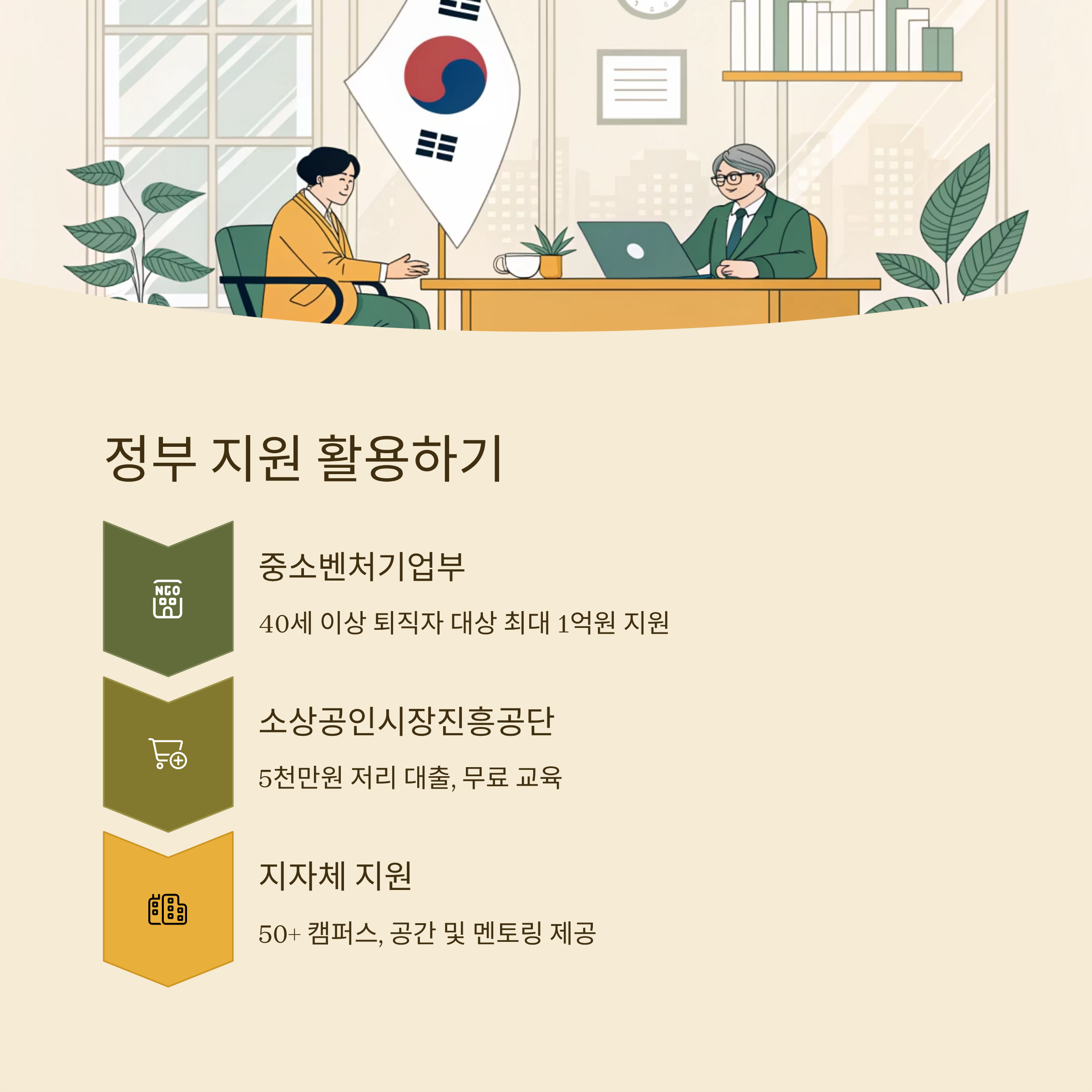 지자체별로는 시니어 창업 지원센터가 존재하는데요, 예를 들어 서울시는 ‘50플러스 캠퍼스’를 통해 중장년 교육과 멘토링, 사무 공간까지 지원하고 있어요. 대전·광주·부산 등 지방자치단체들도 창업보육센터와 창업 지원금을 제공하니 거주지 지자체 홈페이지를 꼭 확인해보세요.