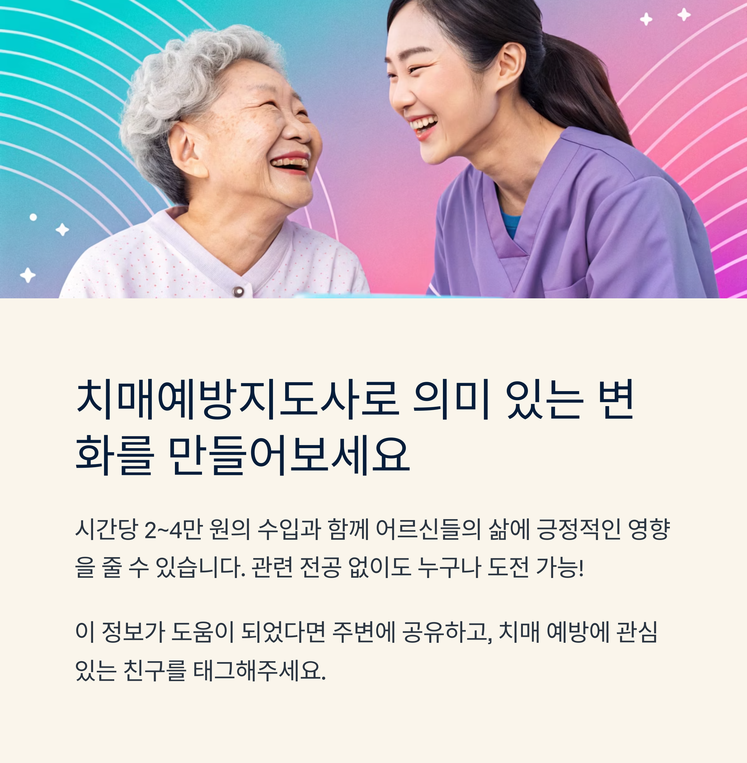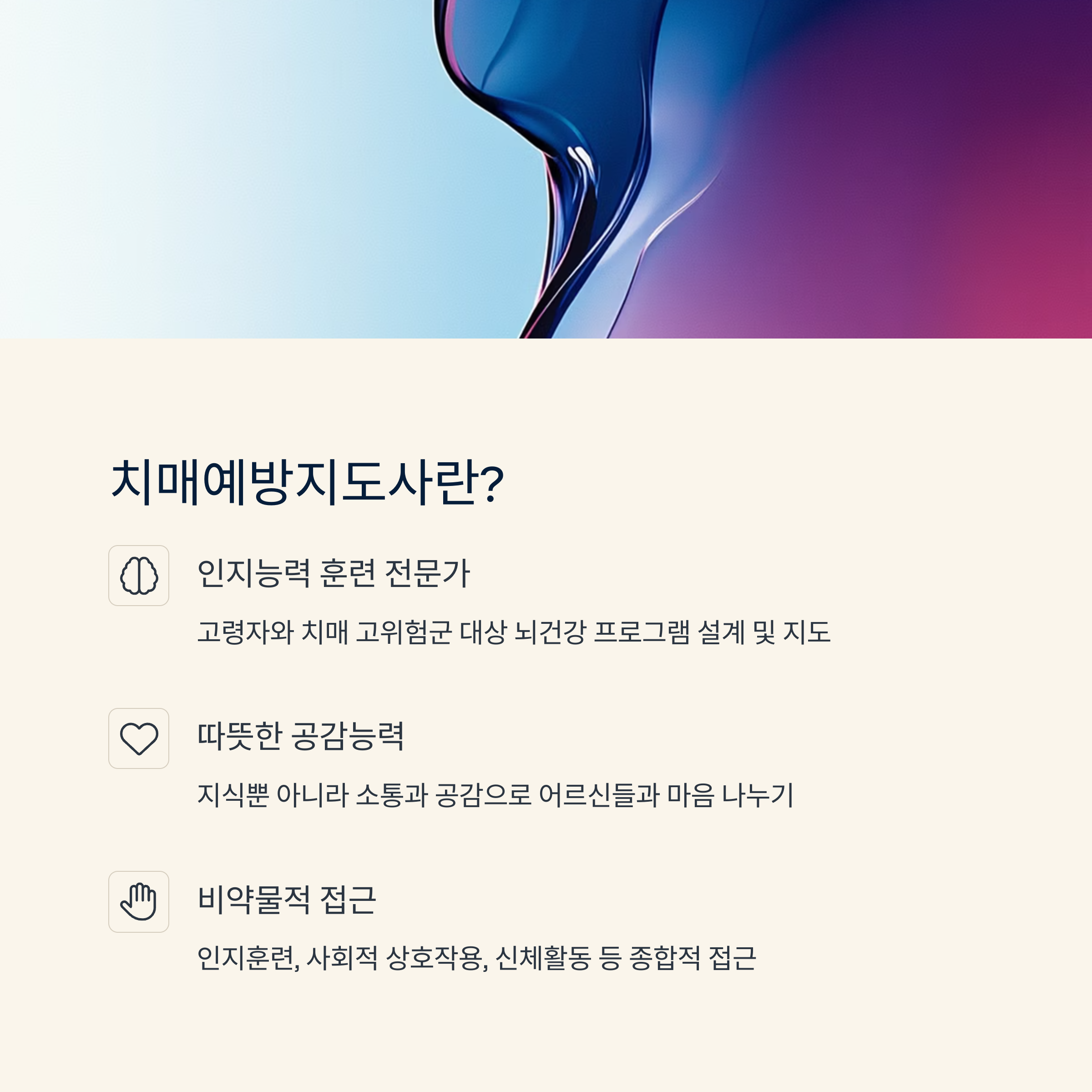 누구나 늙고, 기억이 흐릿해지는 시기가 와요. 그때를 준비하고 이웃을 돌보는 따뜻한 역할이 바로 치매예방지도사라고 할 수 있어요. 🧓👵