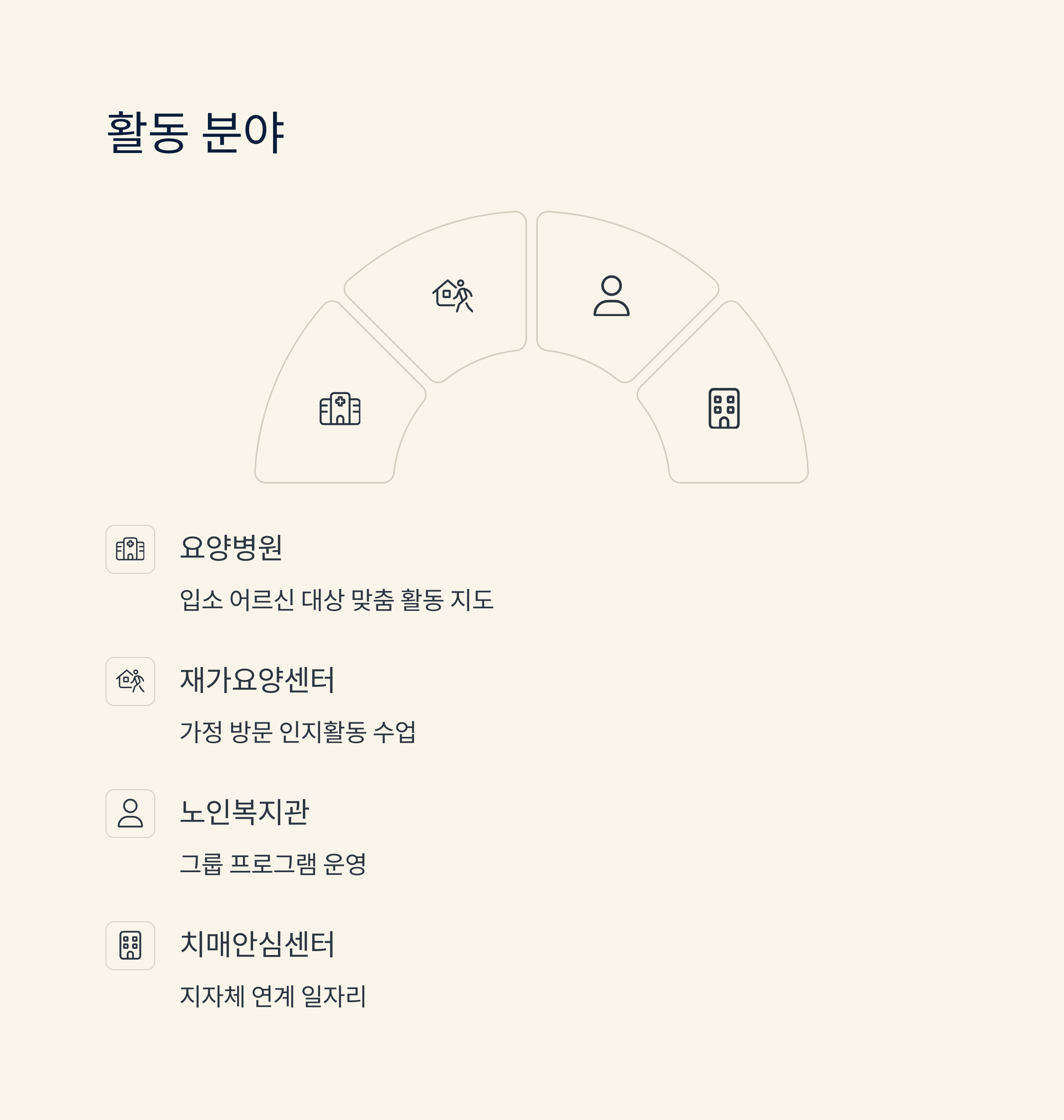 치매예방지도사 자격증을 취득하면 다양한 분야에서 활동할 수 있어요. 대표적인 예로는 노인복지관, 요양병원, 재가요양센터, 지역 커뮤니티센터 등이 있고, 일부는 초등학교나 평생교육센터에서 교육 활동으로 이어지기도 해요.