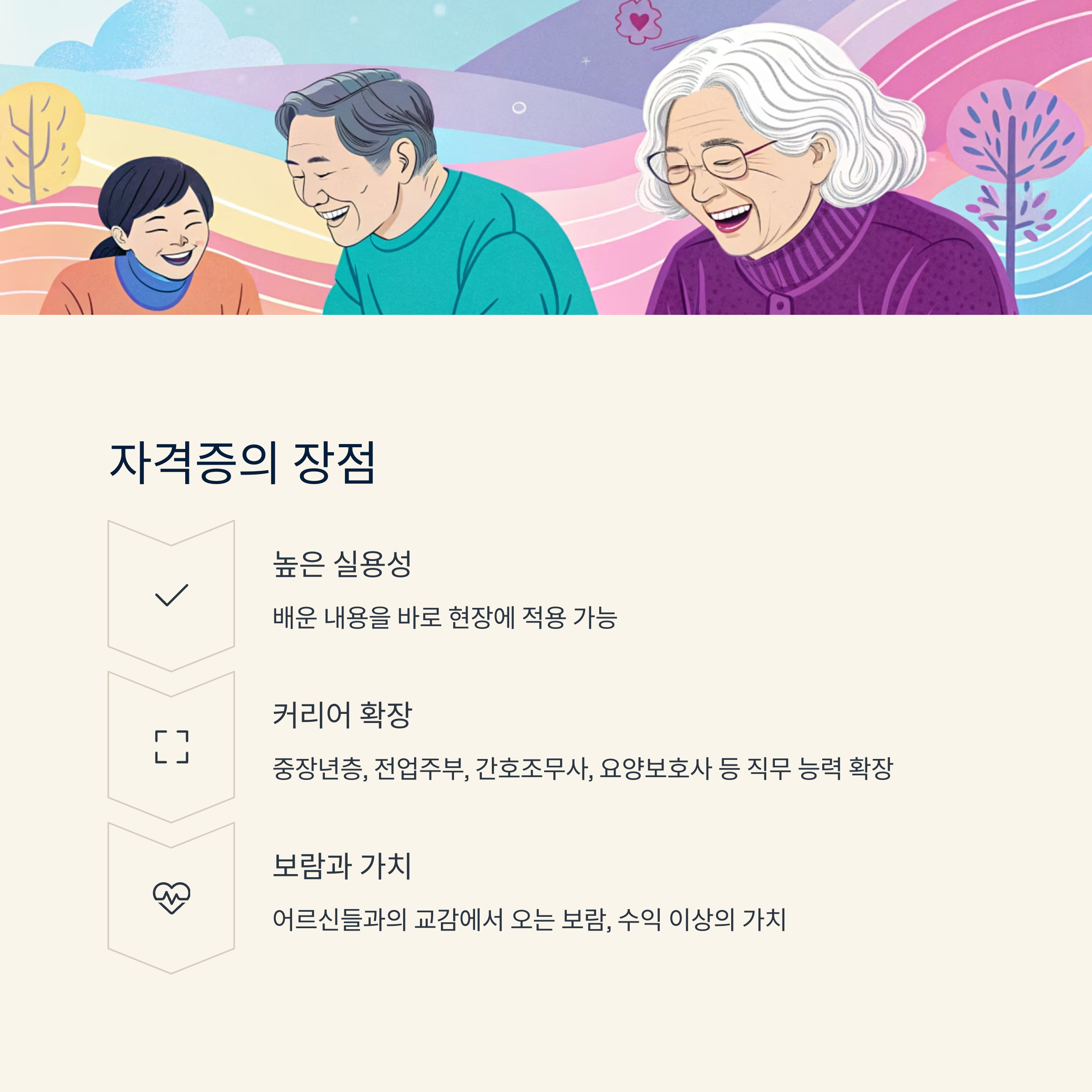 또한 은퇴 후 제2의 인생을 준비하는 중장년층, 전업주부, 간호조무사, 요양보호사, 사회복지사 등 다양한 직군에서 직무 능력을 확장하는 데 매우 유용하게 쓰일 수 있어요. 자격 하나로 커리어가 넓어지는 느낌이에요.