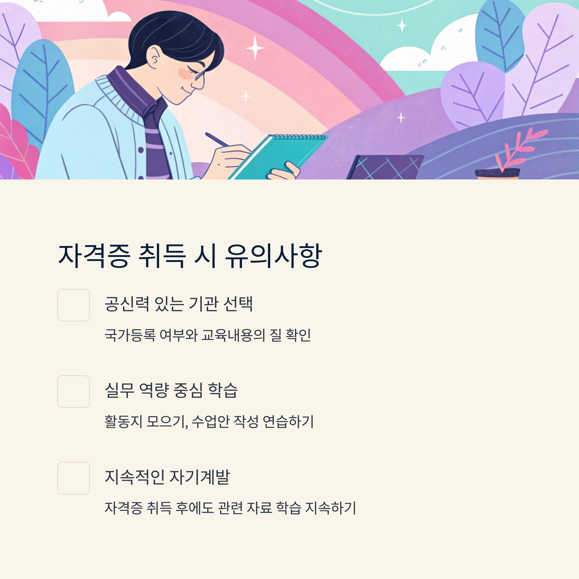 자격증 취득을 고려할 때 가장 중요한 점은 ‘공신력 있는 기관’에서 발급받는 것이에요. 민간자격증은 무수히 많기 때문에 국가등록 여부와 교육내용의 질을 잘 따져봐야 해요.