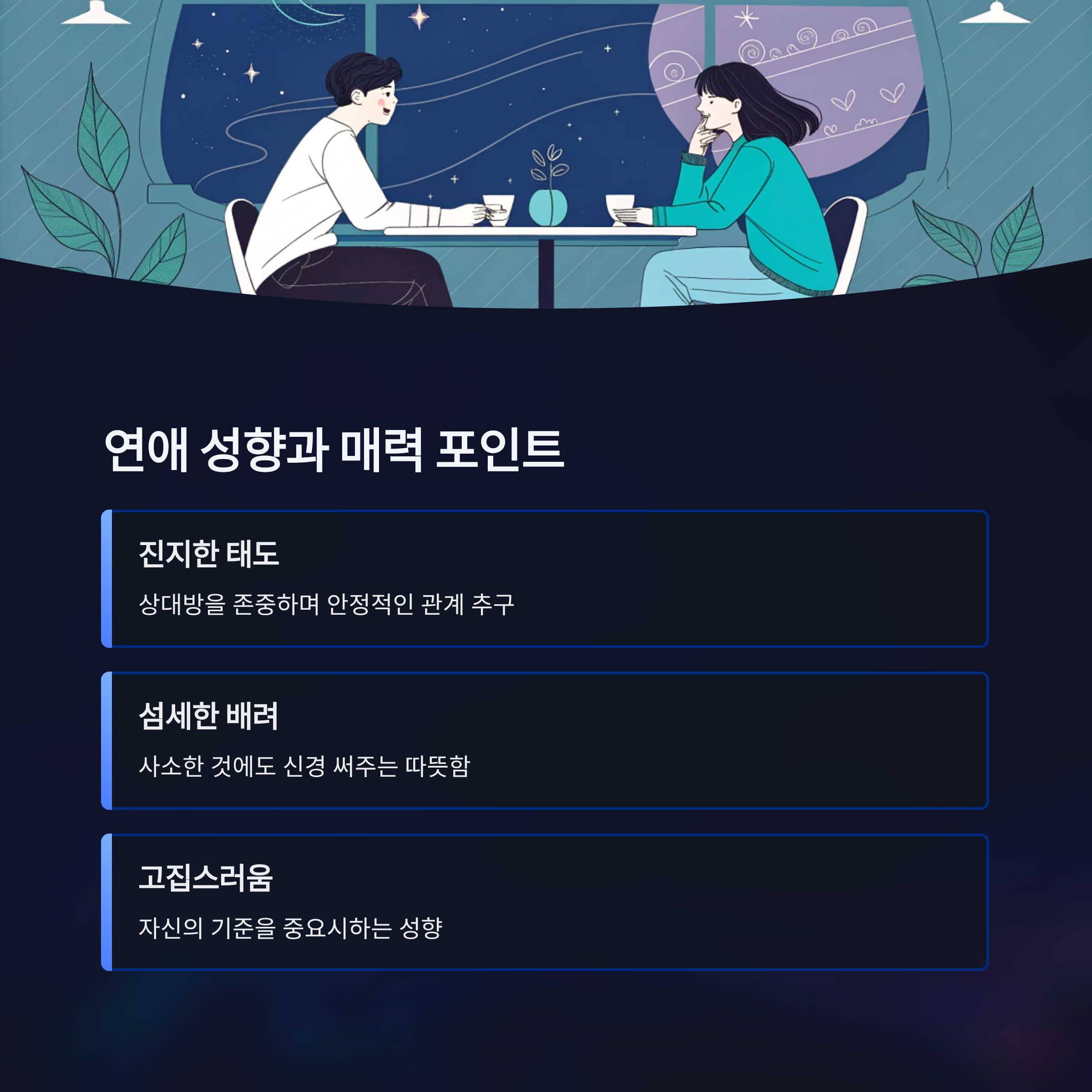 A2. 진지하고 배려심 있는 태도로 연애를 해요. 안정적인 관계를 원한다면 잘 맞을 수 있어요.