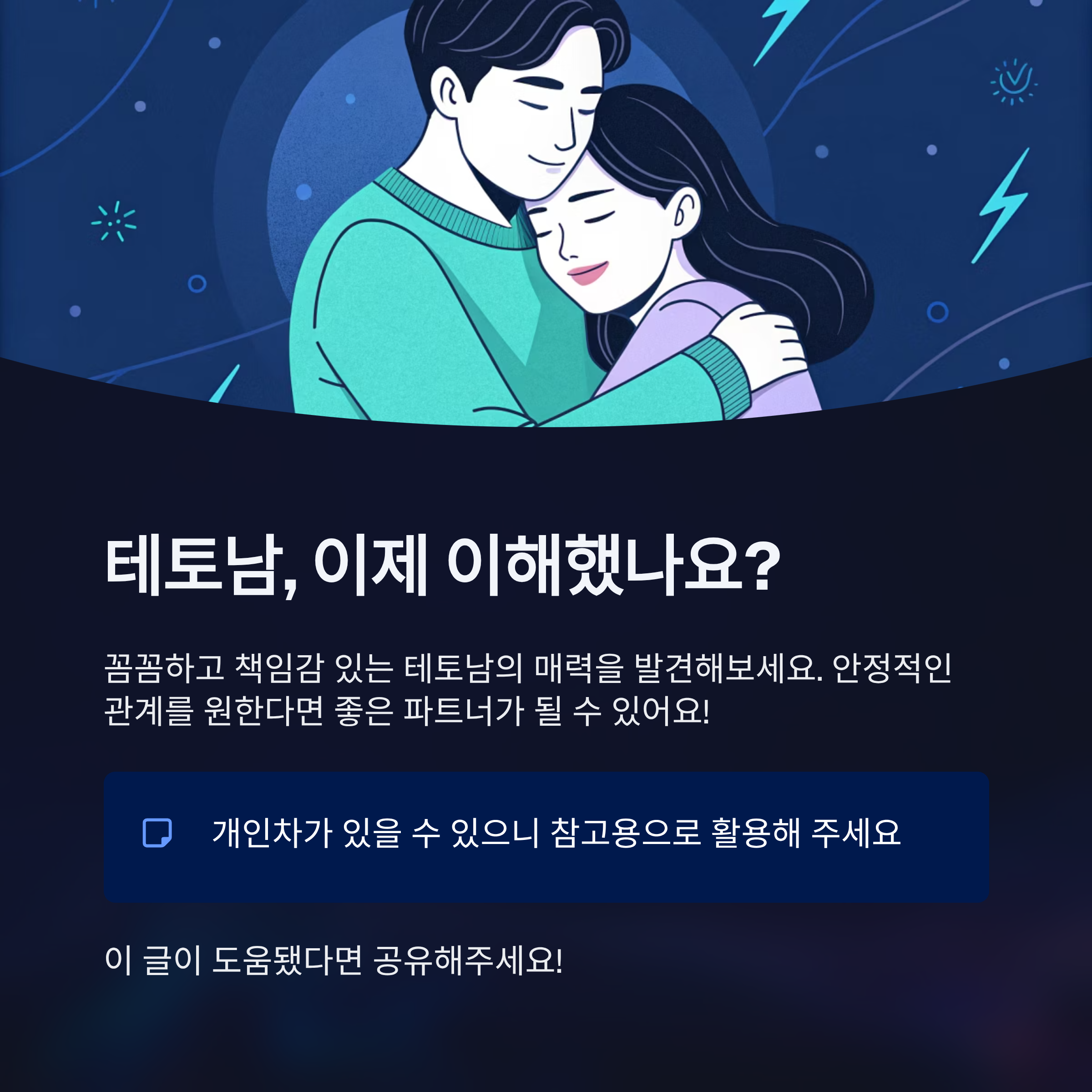 연애에서 테토남은 진지한 태도를 보여요. 쉽게 흔들리지 않고 상대방을 존중하는 편이라 안정적인 관계를 원하는 사람에게 잘 맞아요. 사소한 것에도 신경을 써주는 섬세함이 장점이에요.