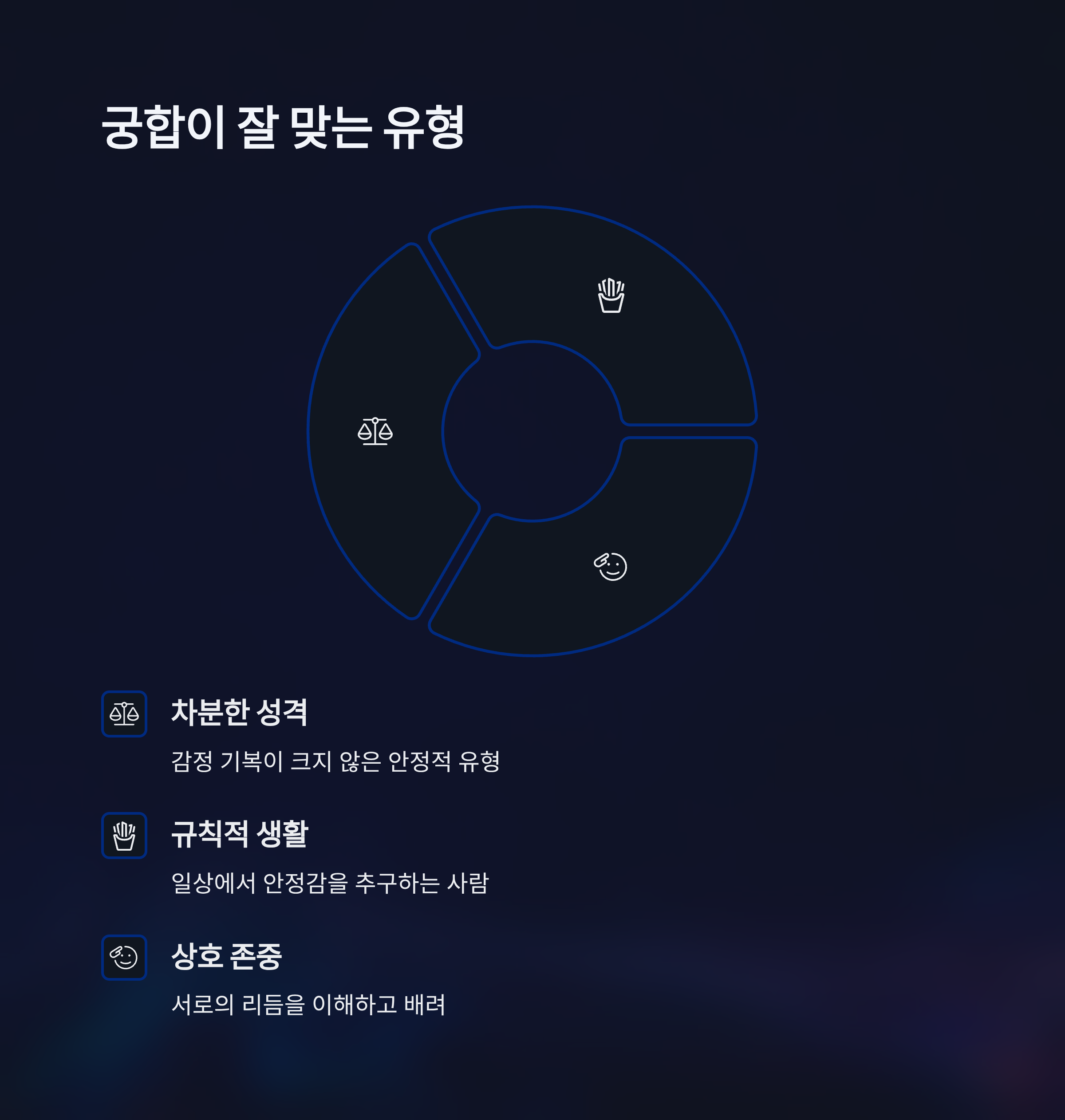 반대로 즉흥적이고 변화무쌍한 사람과는 갈등이 생길 수 있어요. 하지만 서로를 이해하려는 노력이 있으면 충분히 균형을 맞출 수 있어요. 결국 궁합은 개개인의 태도와 배려가 중요한 요소로 작용해요.