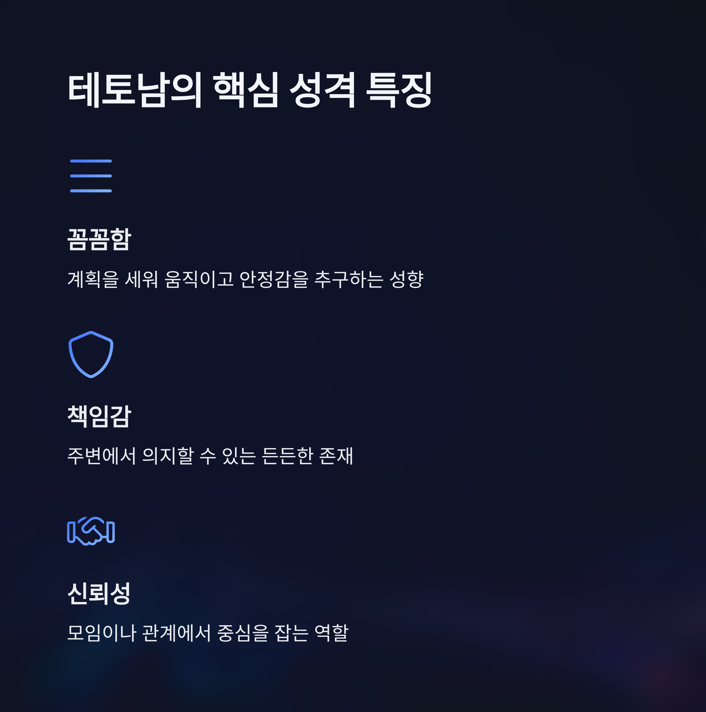 테토남은 꼼꼼하고 차분한 성격으로 알려져 있어요. 계획을 세워 움직이고 즉흥적으로 변화를 주기보다 안정감을 추구하는 편이에요. 이런 점 때문에 친구나 연인 입장에서는 든든하게 느낄 수 있답니다.