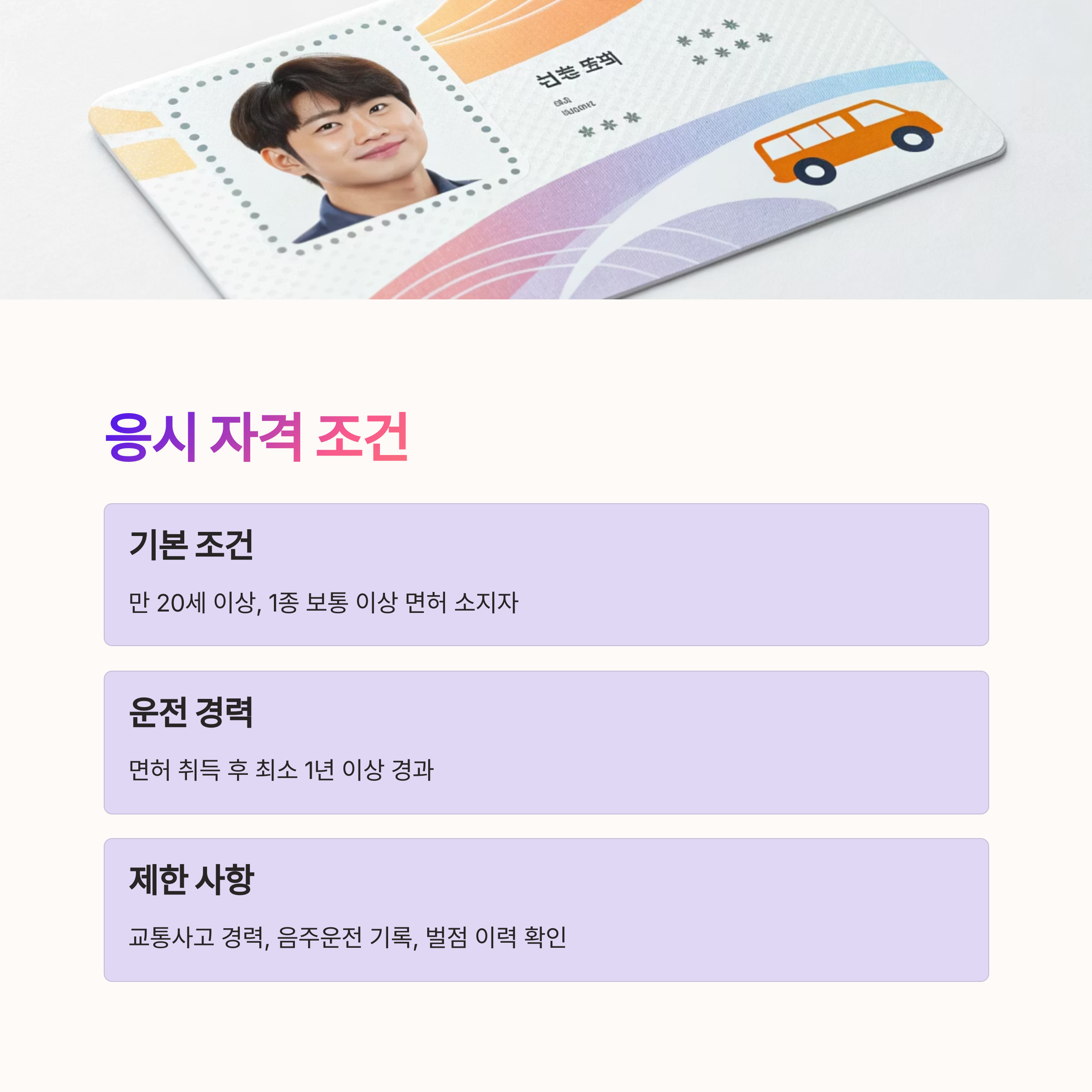 A1. 만 20세 이상, 1종 보통 이상 면허 소지자이며 운전경력 1년 이상이면 대부분 응시할 수 있어요. 다만 교통사고 이력이나 벌점 등에 따라 제한될 수 있어요.