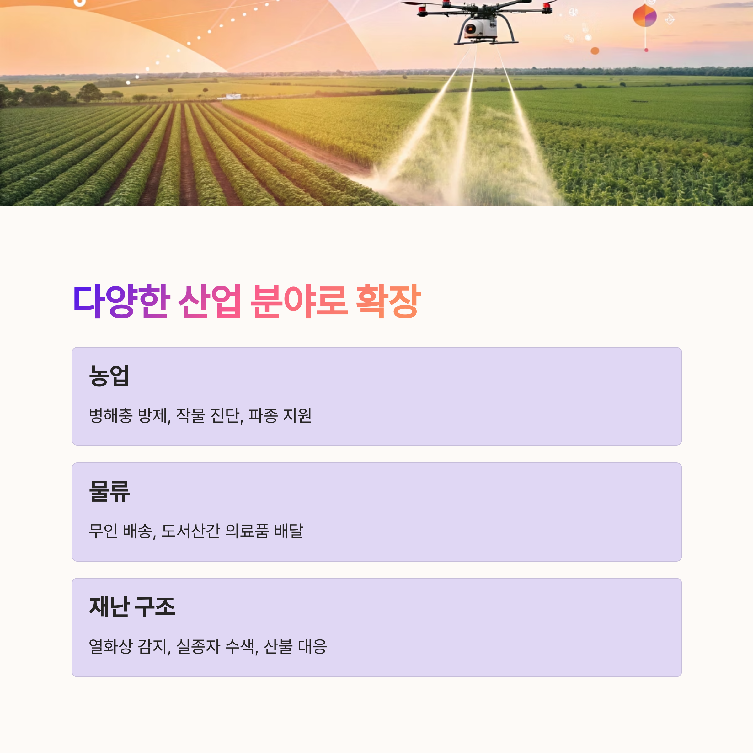 드론은 이제 단순한 항공 촬영 기기를 넘어 다양한 산업의 핵심 도구로 자리 잡았어요. 가장 대표적인 예로는 농업 분야가 있어요. 스마트 농업에서 드론은 병해충 방제, 작물 생육 진단, 파종과 수확 지원까지 다양하게 쓰이고 있죠. 이는 농업 인력 부족 문제 해결에도 큰 도움이 되고 있어요.