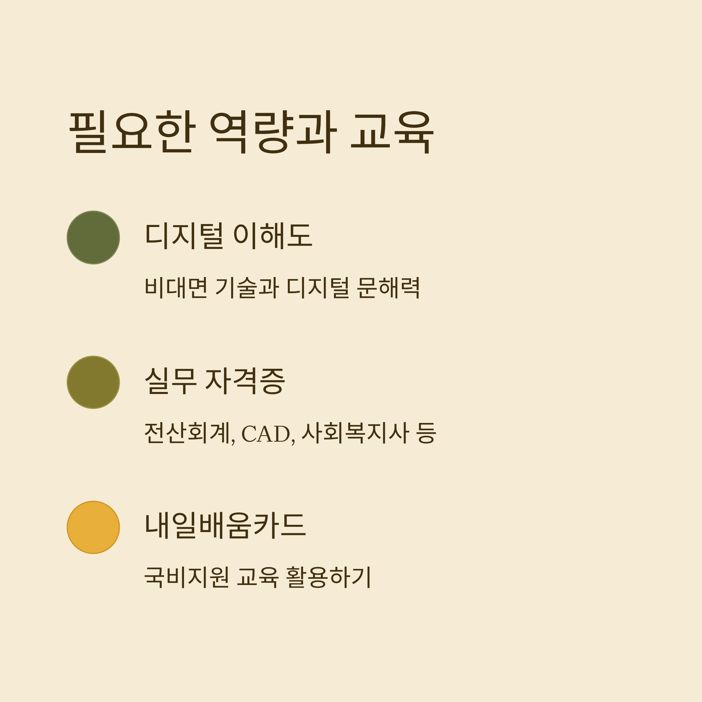 40대 재취업에 성공하기 위해선, 시대에 맞는 ‘새로운 무기’를 장착하는 게 중요해요. 기존 경력만으로는 부족한 경우가 많기 때문에, 기술을 더하거나 자격증을 취득해 실무형 인재로 거듭나는 과정이 필요하답니다.