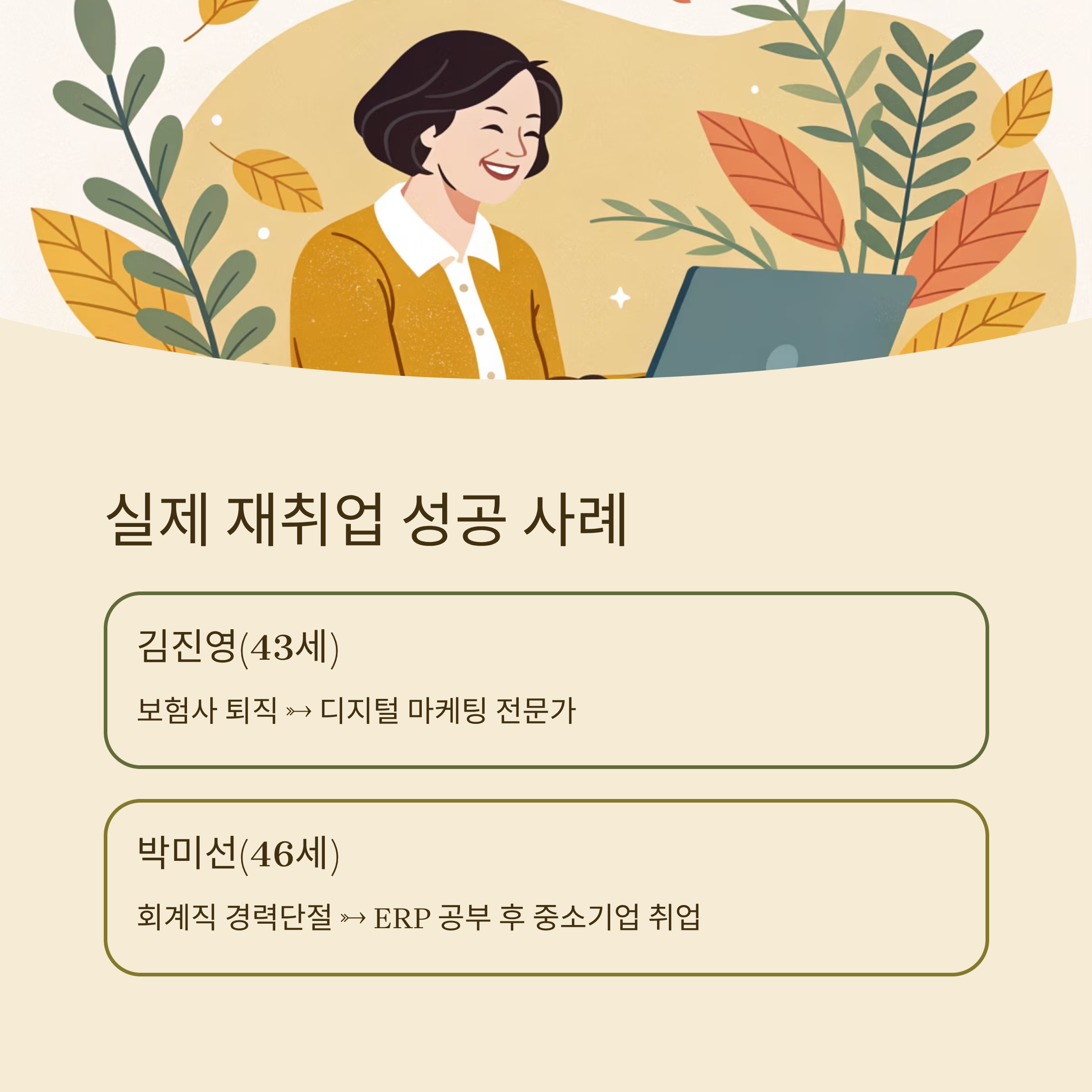 두 번째 사례는 46세에 회계직에서 퇴직한 박미선 씨예요. 육아와 가정 때문에 5년간 경력이 단절되었지만, 온라인으로 ERP 프로그램과 전산회계를 다시 공부했어요. 이후 구청의 취업 연계 프로그램을 통해 중소기업 회계팀에 취업했답니다.