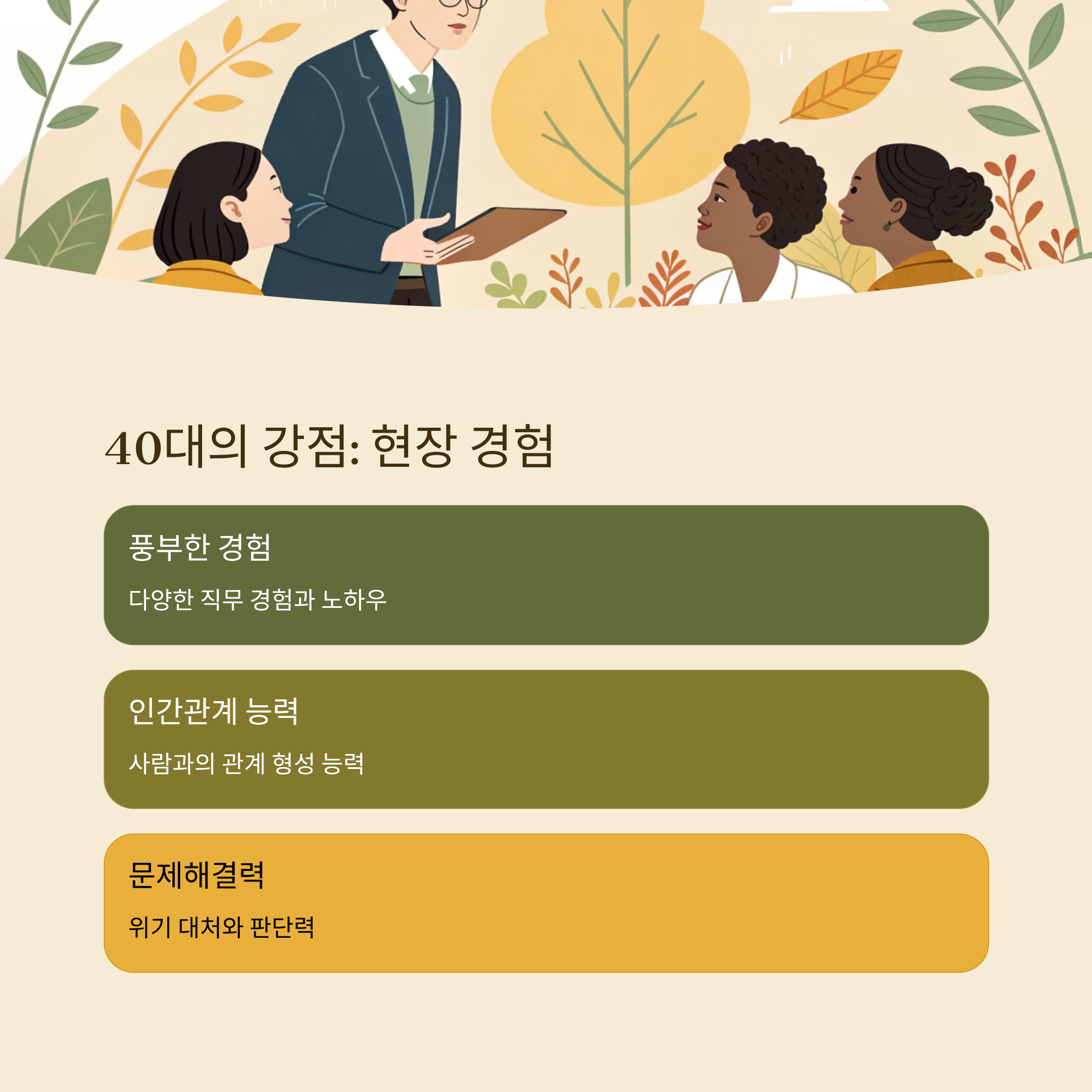 그럼에도 불구하고, 40대는 강력한 무기가 있어요. 바로 '현장 경험'이에요. 다양한 직무를 거치며 쌓은 노하우와 사람과의 관계 능력은 20대와 30대가 따라올 수 없는 강점이랍니다.