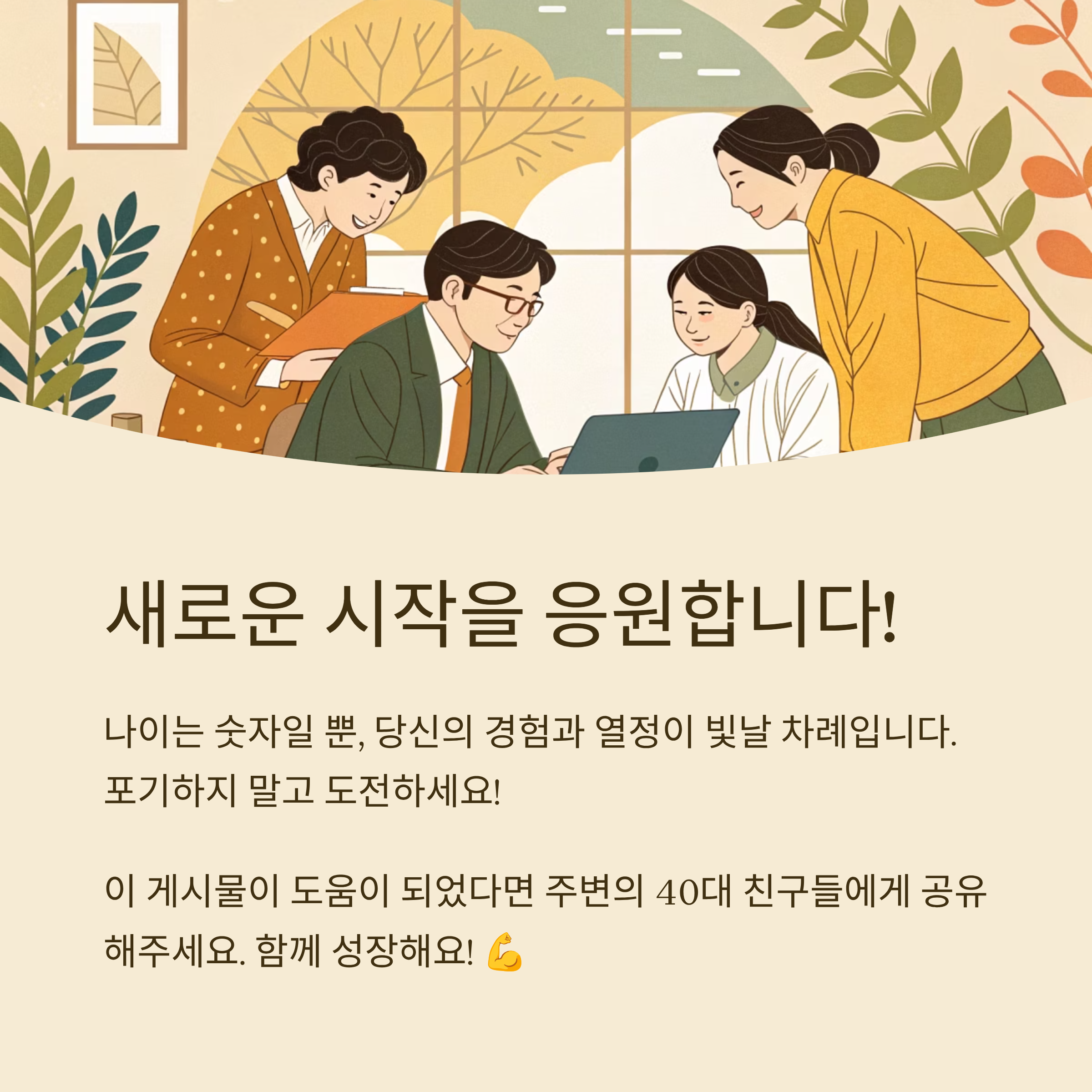 ※ 본 콘텐츠는 40대 재취업을 위한 일반 정보 제공을 목적으로 하며, 법적 또는 정책적 효력을 지니지 않습니다. 개별 상황에 따라 고용노동부 또는 전문기관의 상담을 권장드려요.